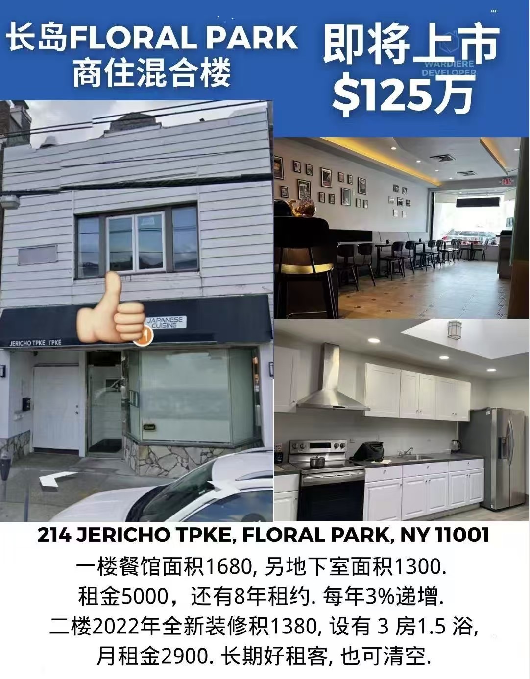 [烟花][烟花]长岛 Floral Park 商住混合楼出售 售价 $125万[庆祝]【地理位置】位于繁华 Jericho Turnpike 商业圈,人流车流量大,商业价值高!