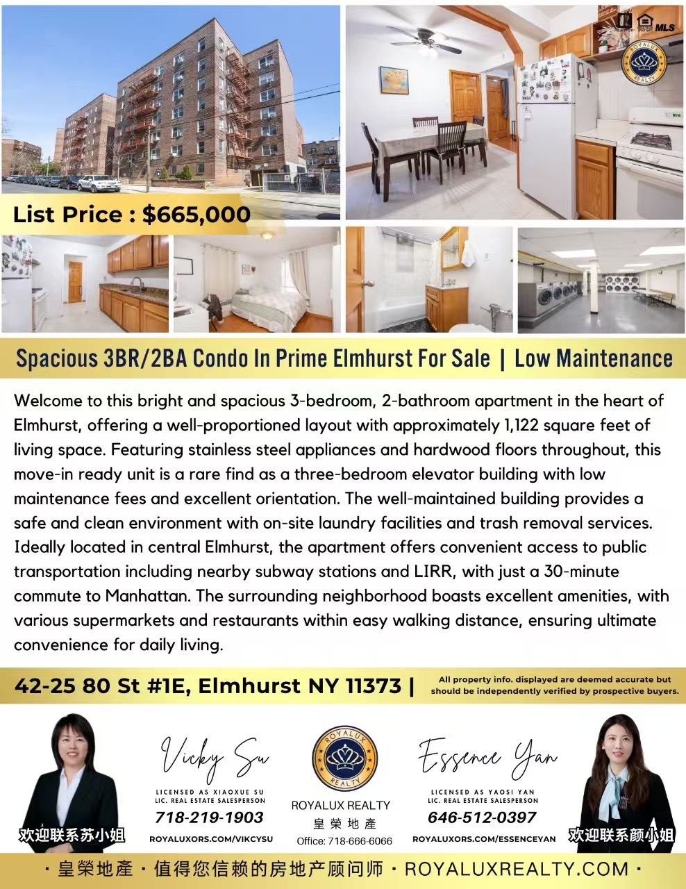 【新上市】皇荣地产独家代理 Elmhurst 电梯三房公寓出售