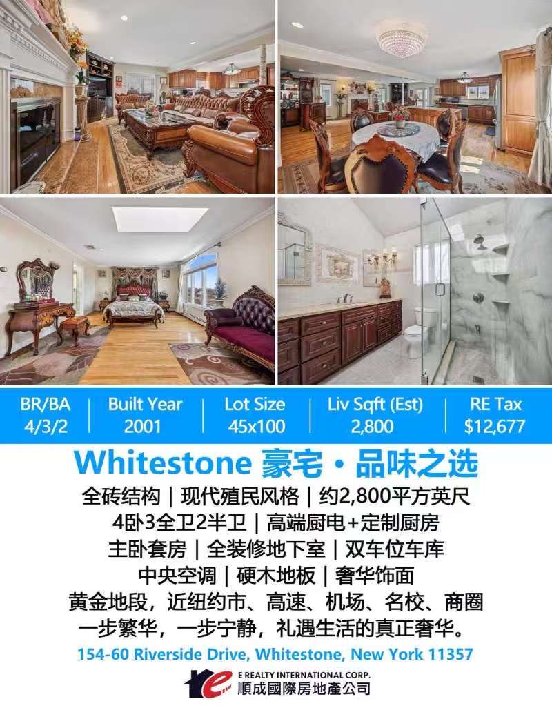 Whitestone白石镇一家庭出售 带地下室+前后院 格局方正 租售皆宜白石镇合法一家庭出售 稀有上市 可贷款 适合首次购房者白石镇豪华海边享受生活型一家庭🏠 一楼:客厅,餐厅,厨房,半套卫生间。超高双车库。二楼:4房三浴。独立出入地下室:洗衣房,半套卫生间。154-60 Riverside Dr Whitestone , NY 11357 电6465089880