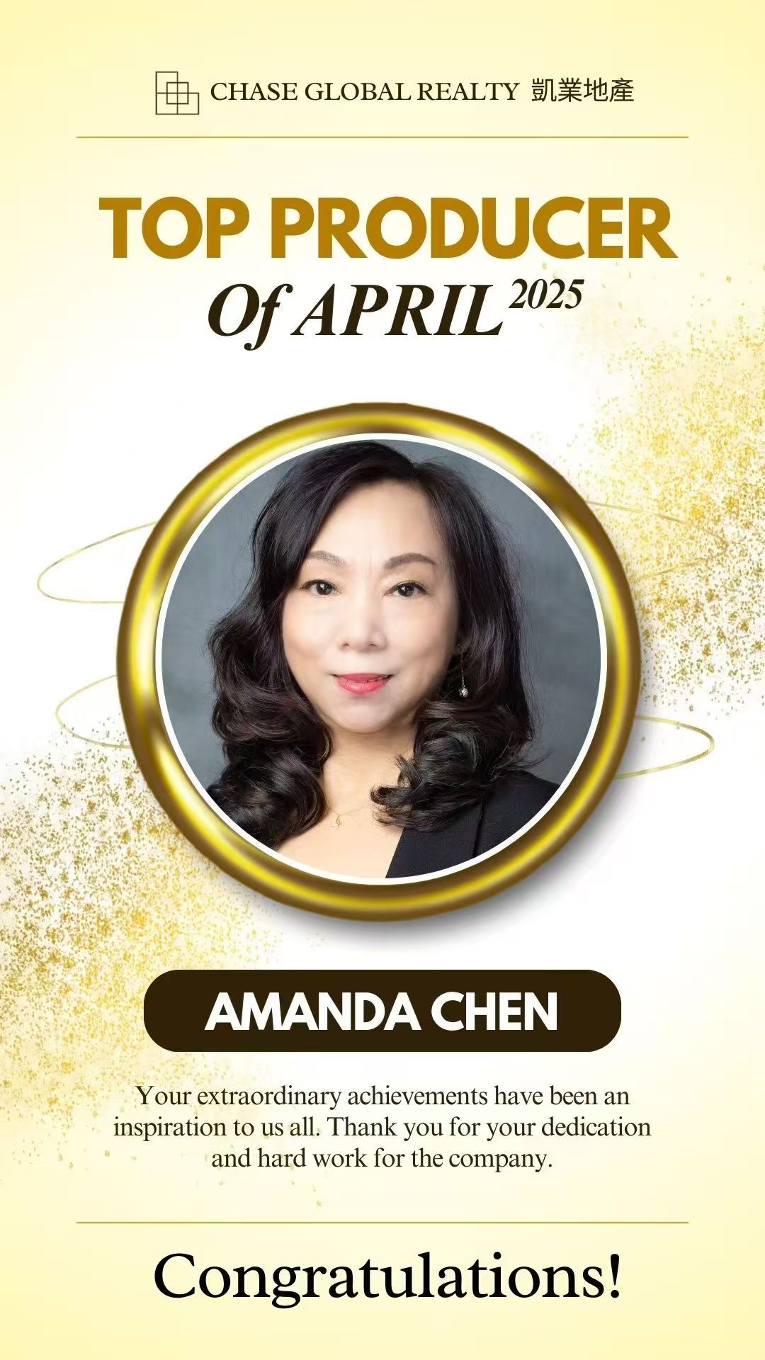 I'am so honored to receive Chase Global Realty's Top Producer Award of the Month April, 2025! 💛