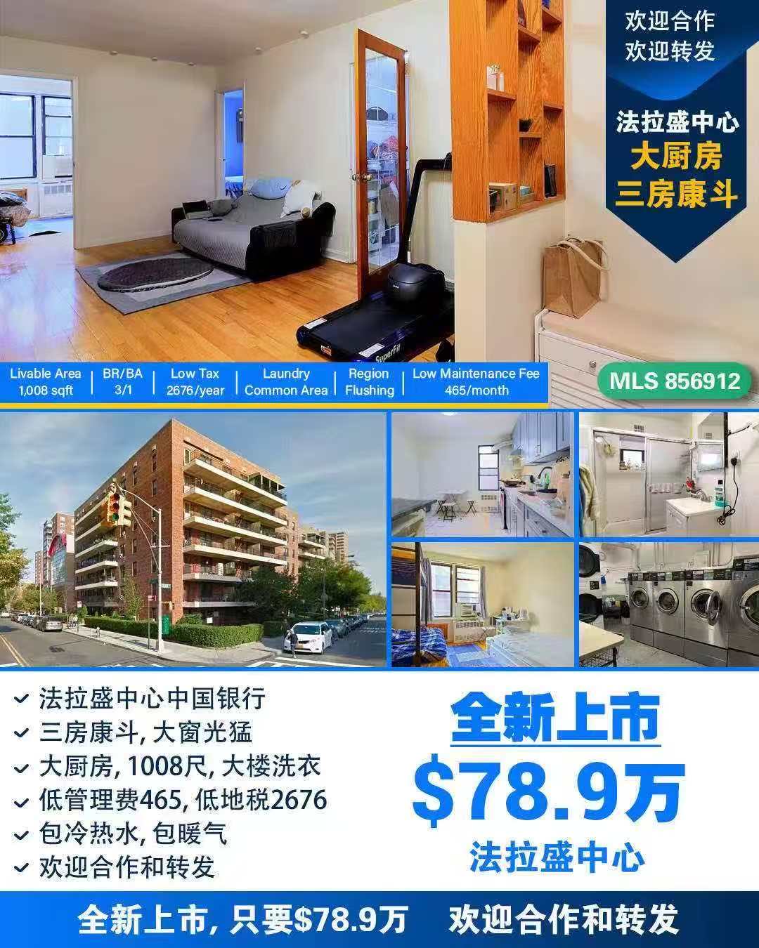 法拉盛康斗住宅出售 适合华人家庭 投资稳定皇后区法拉盛康斗出售 临近7号地铁 华人生活圈中心 法拉盛中心1008尺 康斗中国银行路口🏠朝南,目前3卧1浴🌟正常地税2600,管理费460(除电全包)💰78.9万☎️jojo 646-651-0110