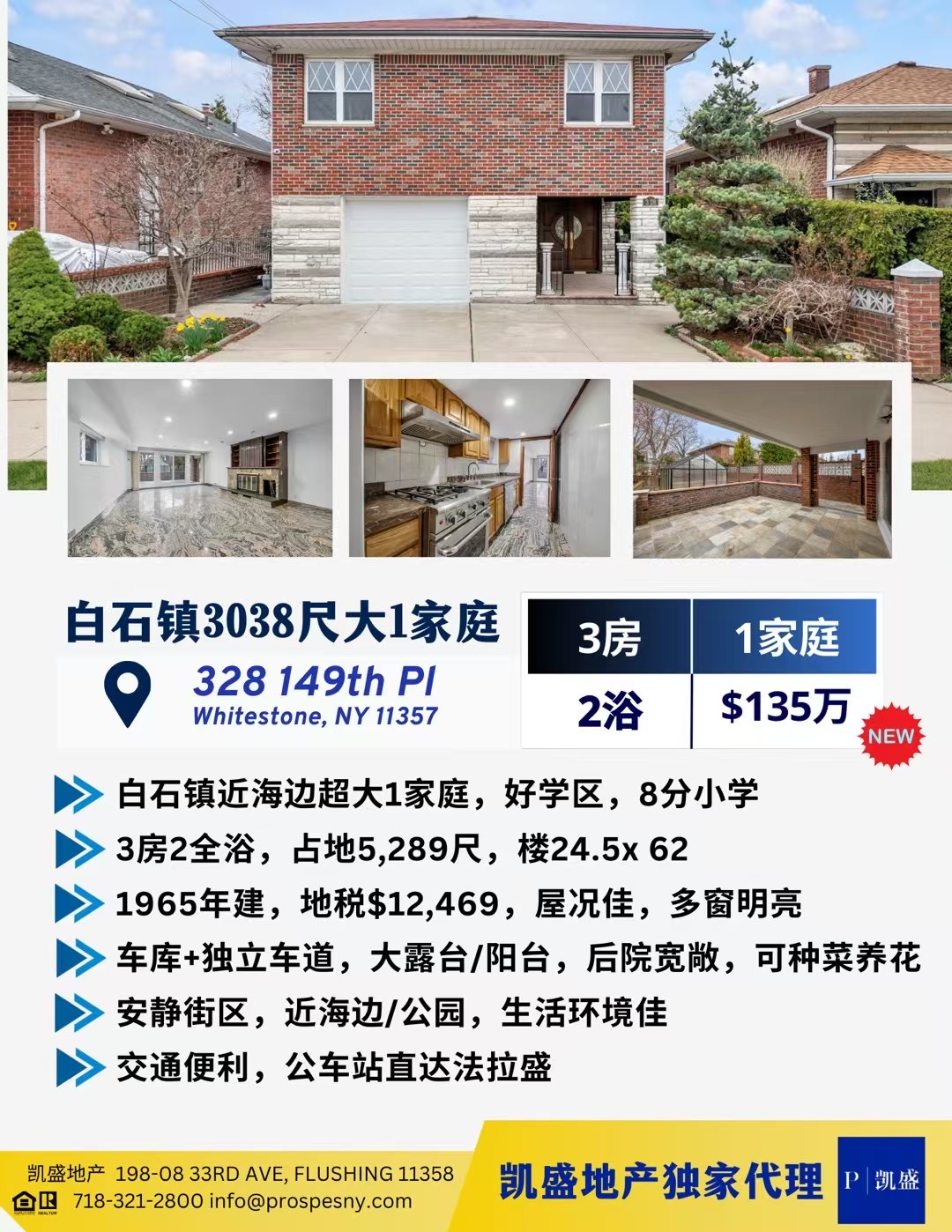 Whitestone一家庭出售 带地下室+前后院 格局方正 租售皆宜白石镇合法一家庭出售 稀有上市 可贷款 适合首次购房者凯盛地产💙独家代理💙