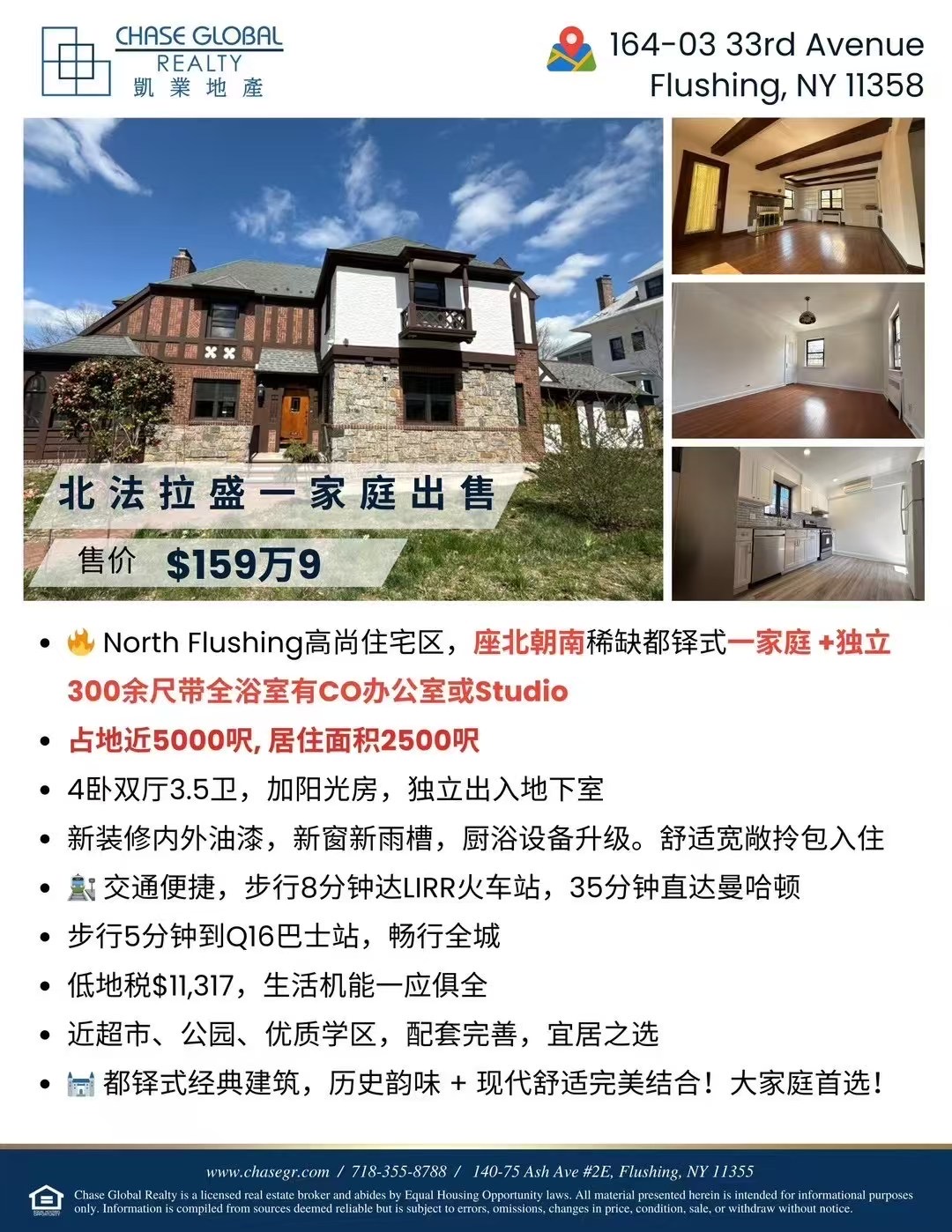 法拉盛独立屋住宅出售 近学区 超大地皮 带车库花园Flushing法拉盛独立屋出售 黄金地段 靠近地铁与超市屋主付SA2 % 重大消息 Breaking News!这套 Broadway Flushing Tudor 独栋美宅 屋主终于松口了!原价 $1.59M ➝ 现在 $1.538M!降!价!了!是时候出手了…4卧双厅4.5卫 + 阳光房 + 独立出入 Basement + 带卫浴办公室/Studio 5000呎大地,约2500呎室内,literally 可以开个 ballroom party!🚶♂️8分钟走到 LIRR,35分钟 Manhattan!低地税,高颜值,大格局,小烦恼 之前问过、犹豫过、还在观察的你。☎️9178829885!