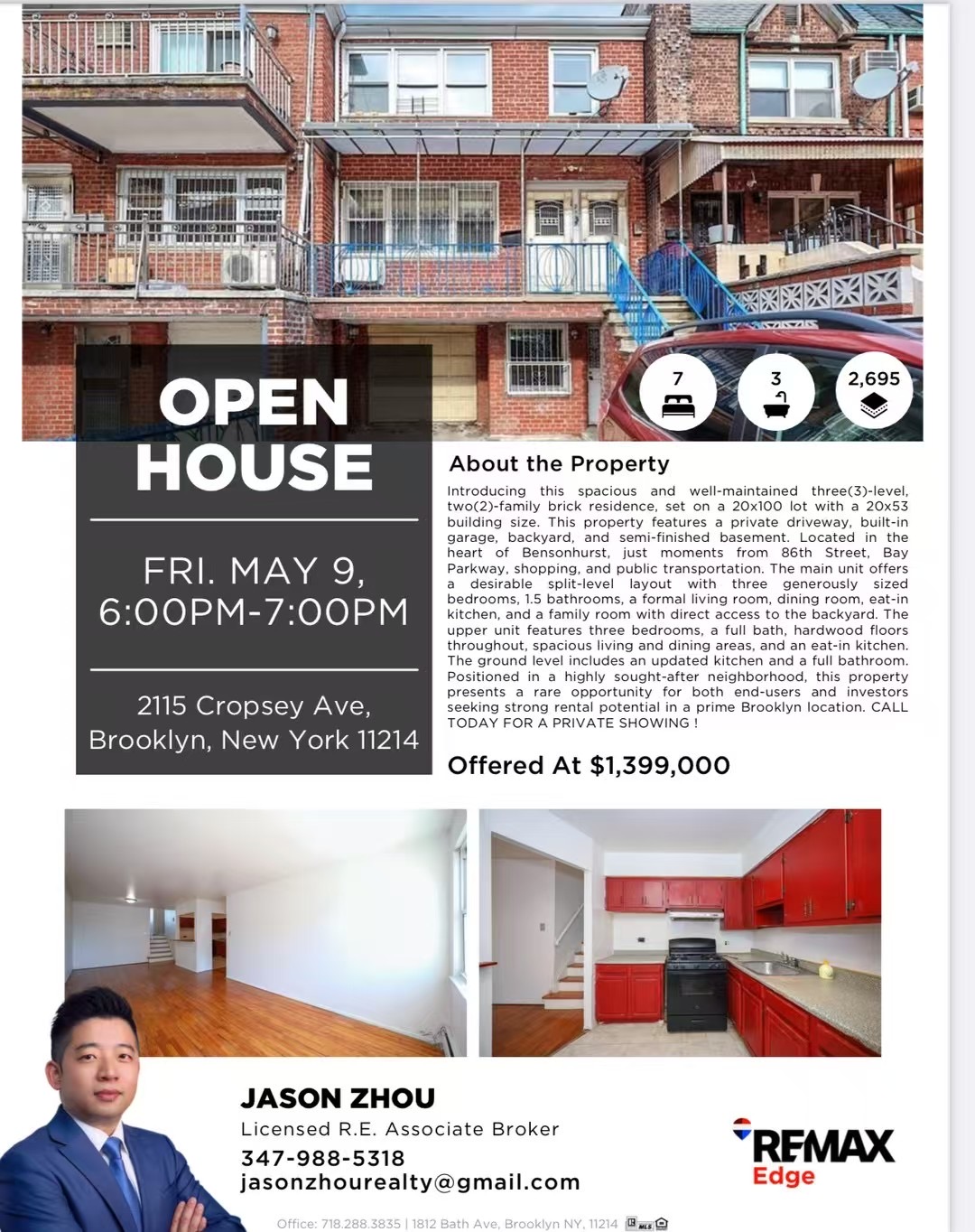 2025纽约华人公展全面启动 法拉盛最新房产信息一站掌握纽约公展全攻略 最新房源招聘信息生活服务一次了解[Fireworks][Fireworks][Fireworks]Open house 公展: 星期五6-7点2115 Cropsey Ave Brooklyn NY11214☎️646.627.2877