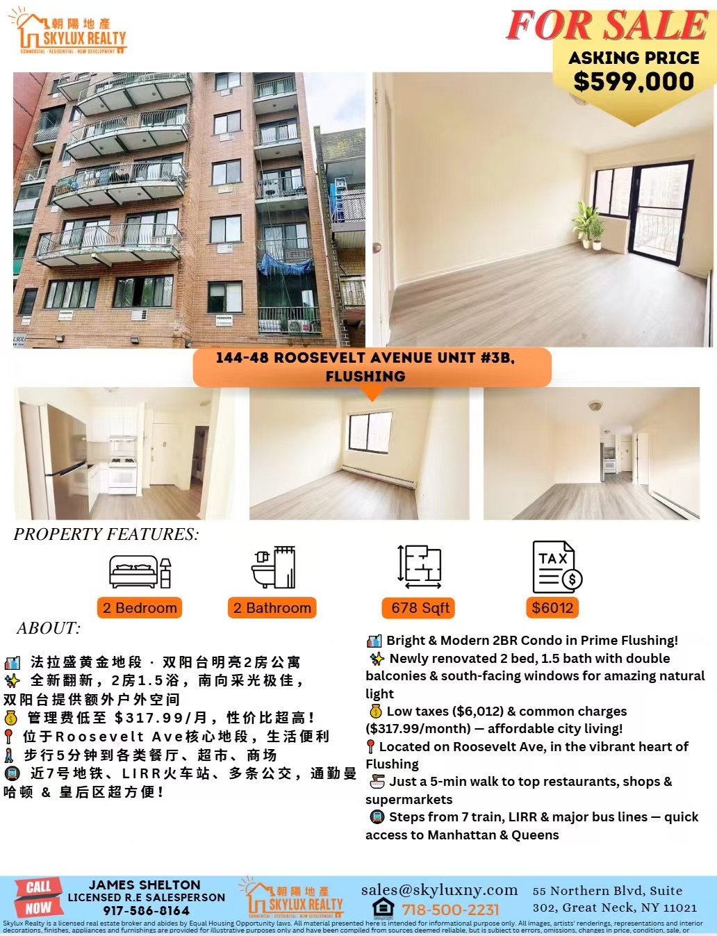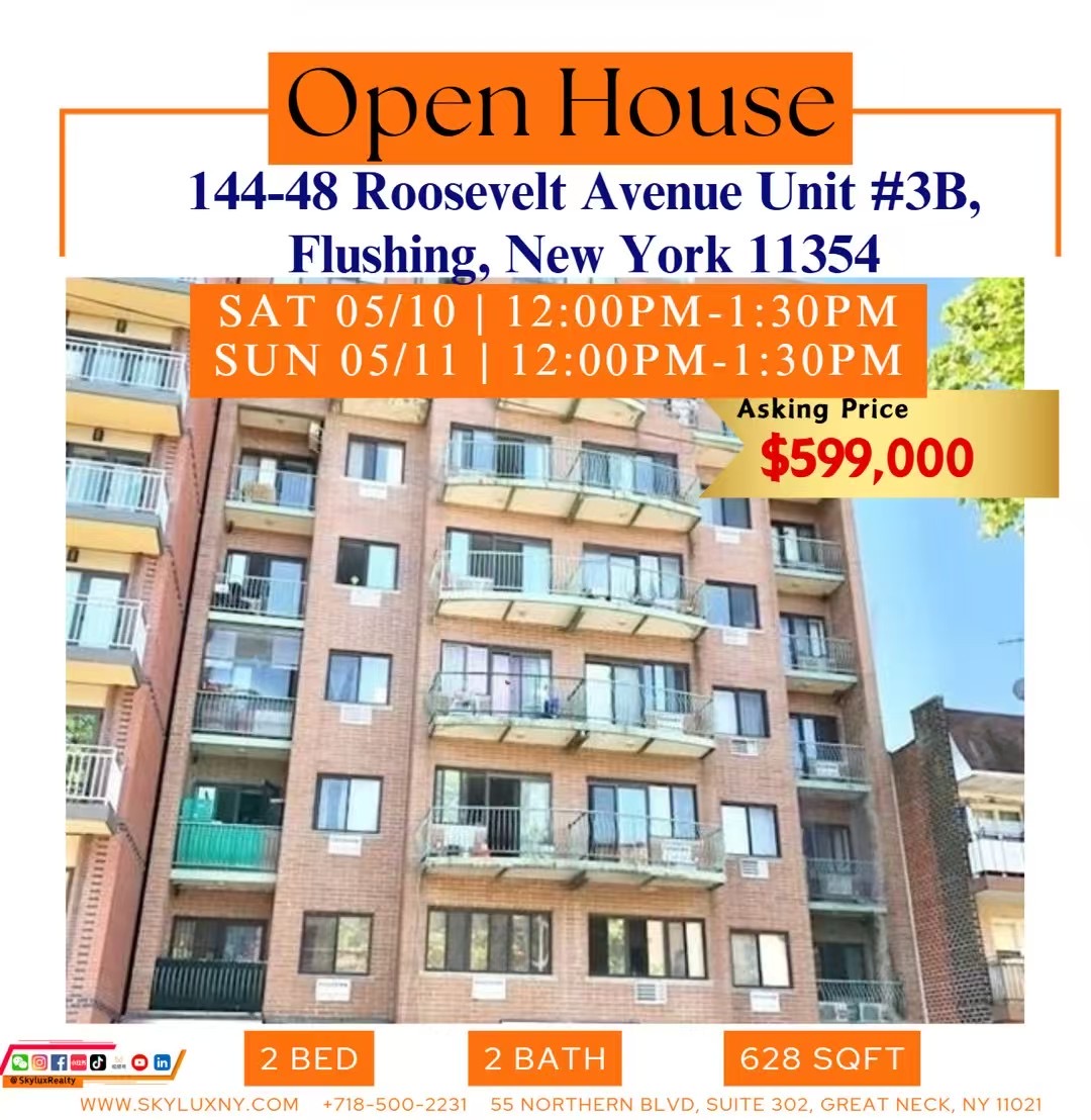 法拉盛康斗住宅出售 适合华人家庭 投资稳定皇后区法拉盛康斗出售 临近7号地铁 华人生活圈中心[太阳][太阳]🏅🏅🆕新上市 週末公展144-48 Roosevelt Ave 3B法拉盛中心康斗出售 59.9萬☀️2臥 1 .5浴 客廳 開放式廚房 飯廳☀️格局方正 朝南窗戶 寬敞明亮 ☀️配有雙陽台,提供額外戶外空間📍管理費 $317.99 / 月 📍地稅 $6,012📍黃金地段 法拉盛市中心