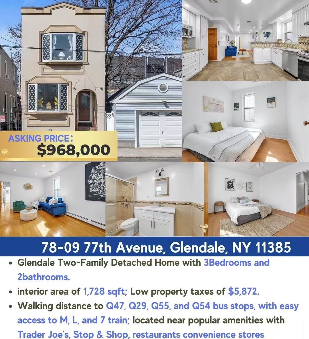 皇后区房子出售🌟【Glendale独立2家庭】出售🌟📍78-09 77th Avenue, Glendale, NY 11385🌟Asking Price $968,000🌟🔵 合法独立2家庭,室内面积约1728尺,可拎包入住
