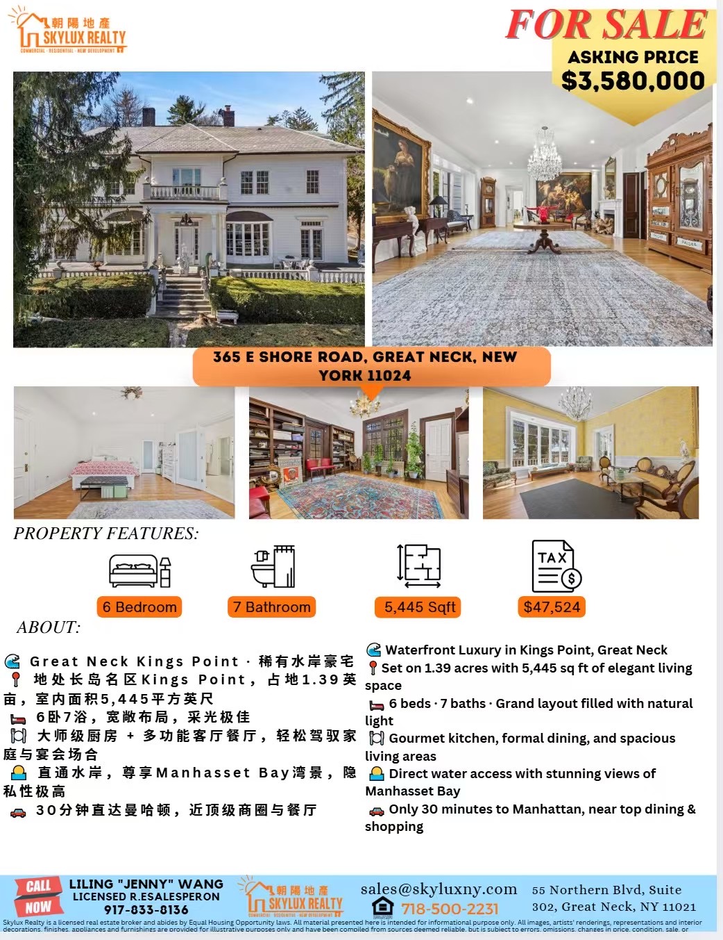 🔊🔊🔊新上市🆕[握手]歡迎合作[握手]大劲 Kings Point Village的豪宅,拥有无敌的Manhasset Bay水景,尤其在夜晚更显迷人。售价为$3,800,000,地税为$40,602,占地1.39英亩,室内面积为5,445平方英尺(不包括阁楼)。