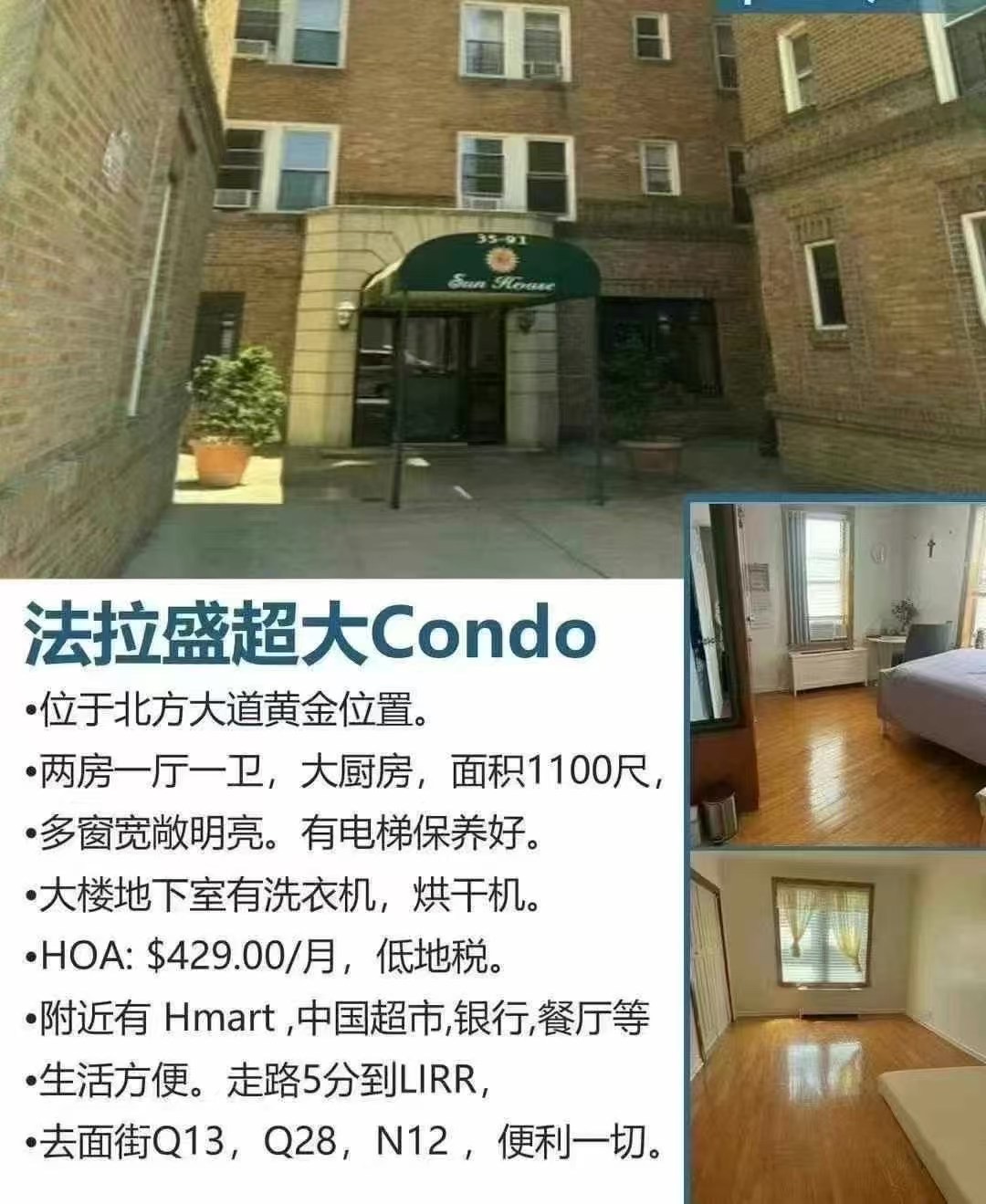 🍀🍀法拉盛超大Condo 出售🍀🍀位于北方大道黄金位置。价格$68万6。