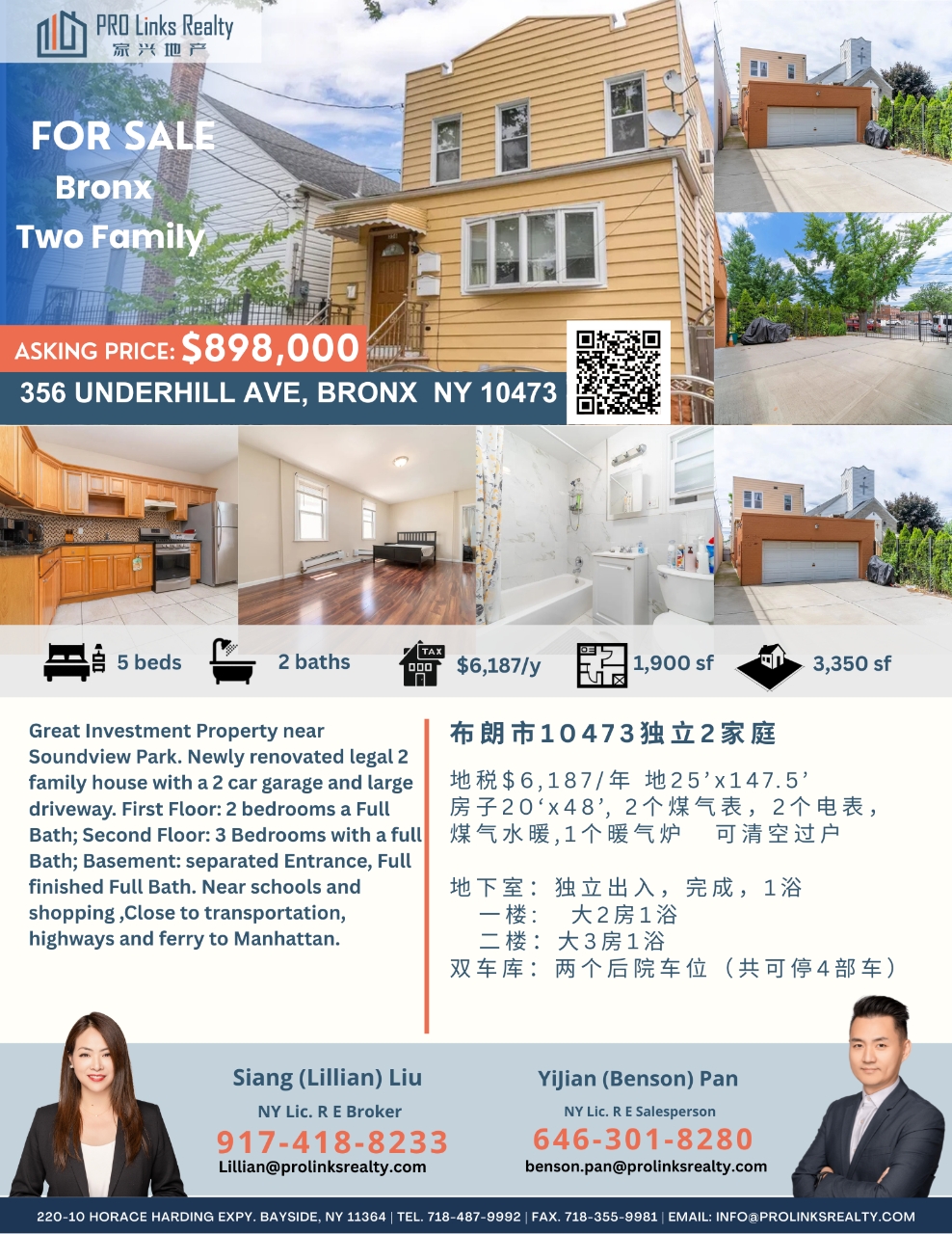 双车库,两个后院车位(共可停4部车)🚌 BX27🏠 356 Underhill Ave., Bronx NY 10473👏欢迎合作转发 ☎️Lillian 刘917-418-8233☎️Benson 潘 646-301-8280