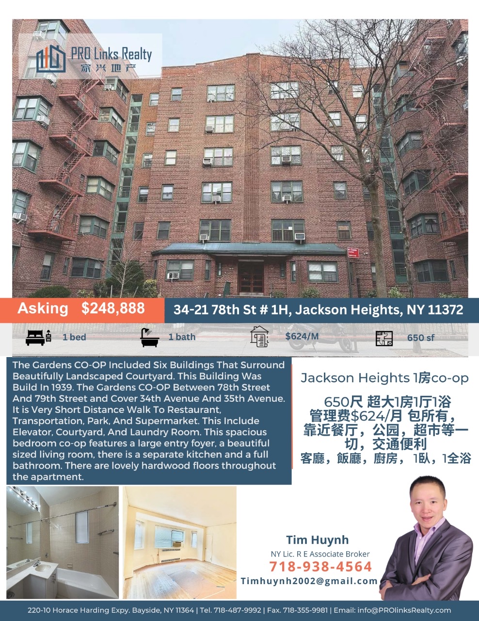 杰克逊高地一房公寓出售 华人区生活方便 交通直达曼哈顿Jackson Heights精装两房公寓出售 皇后区安静街区首选🎉新上市Jackson Heights 1房coop🎉新装修 650尺 超大一房一厅一浴管理费$624/月 包所有,靠近餐厅,公园,超市等一切🧧售$24万9🏠客廳,飯廳,廚房, 1臥,1全浴🏠34-21 78th St #1H Jackson Heights, NY 11372👏欢迎合作转发☎Tim:718-938-4564