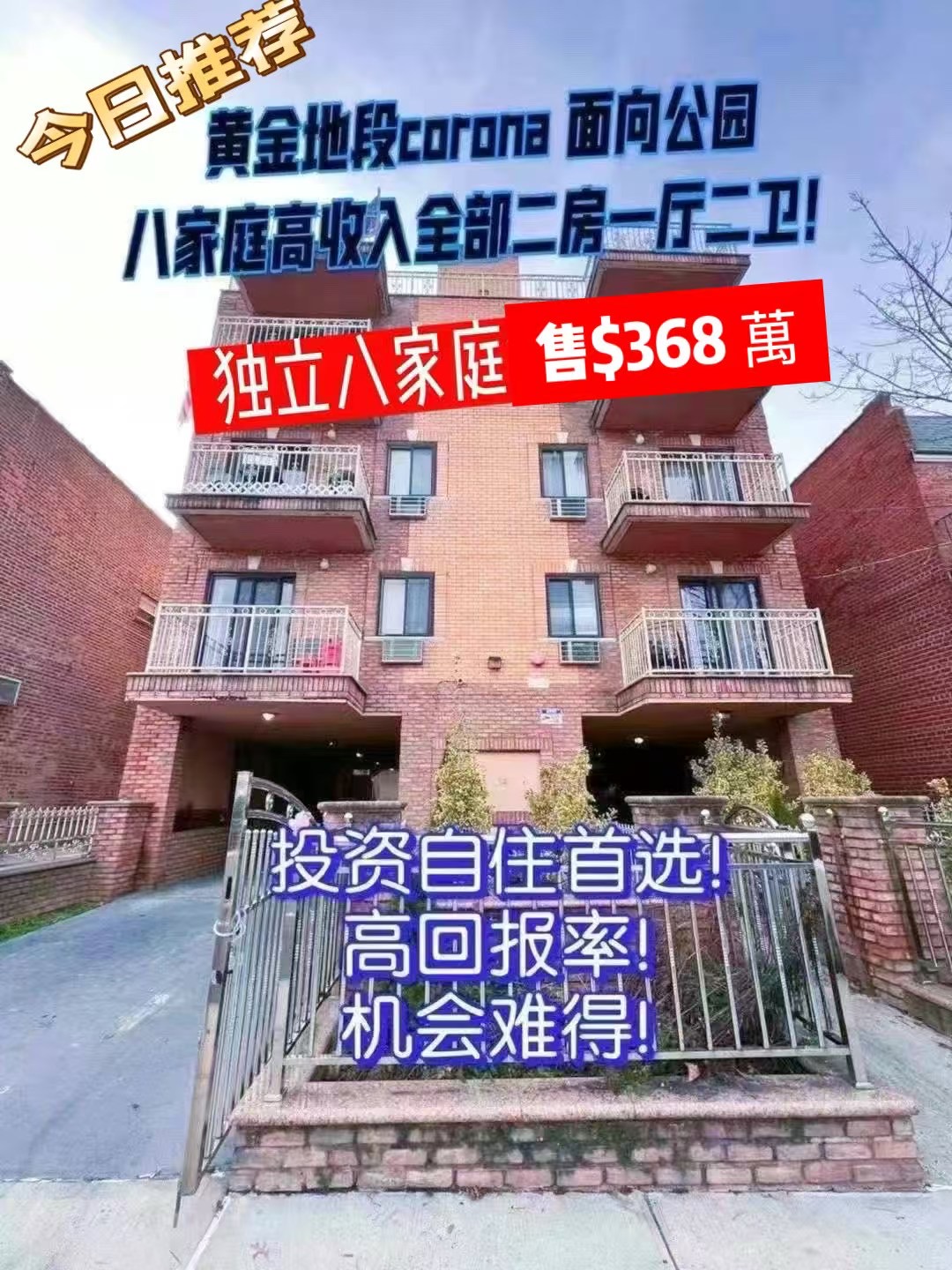 🏠售价$368万!适合1031 转换!投资首选!地址:54-11 111st corona 👏欢迎合作转发!电话:646-508-9880 Judy