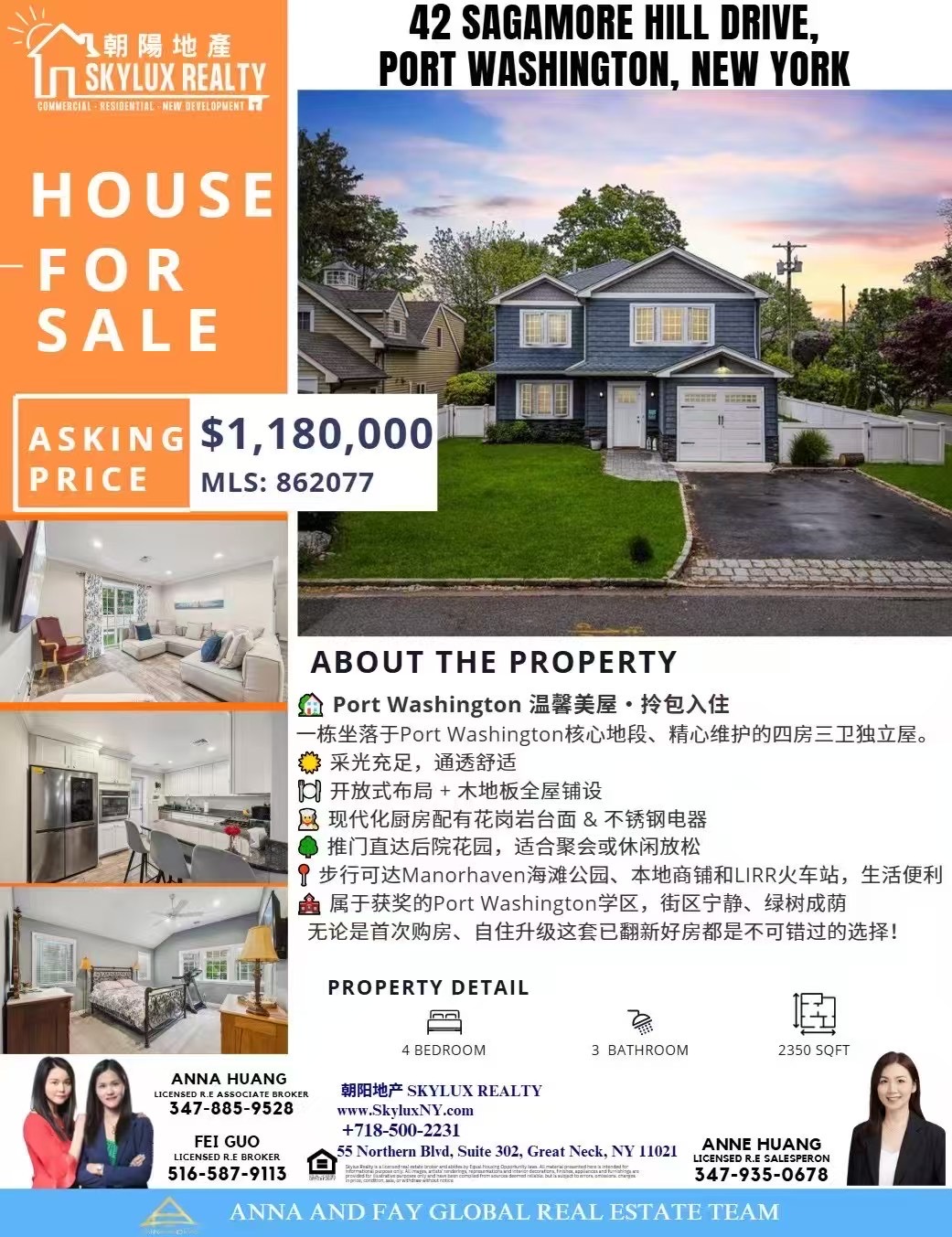长岛出售欢迎来到位于Port Washington核心地段的温馨住宅 42 Sagamore Hill Drive。这是一栋充满阳光、维护得非常周到的住宅,完美融合了舒适与便利,拥有4间宽敞卧室和3间升级装修的全套卫浴。
