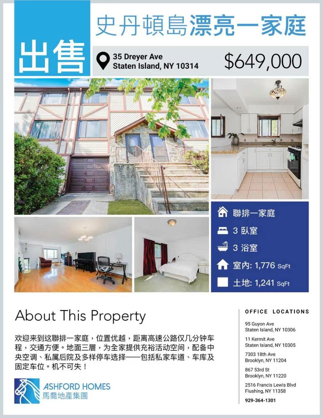 史丹顿岛一家庭住宅出售 华人区安静街道 学区好 房东诚售Staten Island桥头地段一家庭出售 富人区环境优雅 适合自住