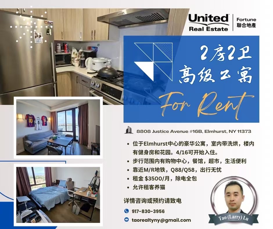 Flushing全新电梯康斗出租 室内洗衣 烘干齐全 家具齐法拉盛高层康斗出租 采光好 近超市餐馆 华人生活圈 法拉盛品牌豪华康斗出租 家具全配 长短租灵活可谈法拉盛新建楼盘康斗出租 富人区设计 管理一流🔥联合地产独家代理房屋出租🔥☎️详情咨询或预约 516-990-8888或直接联系Listing agent.