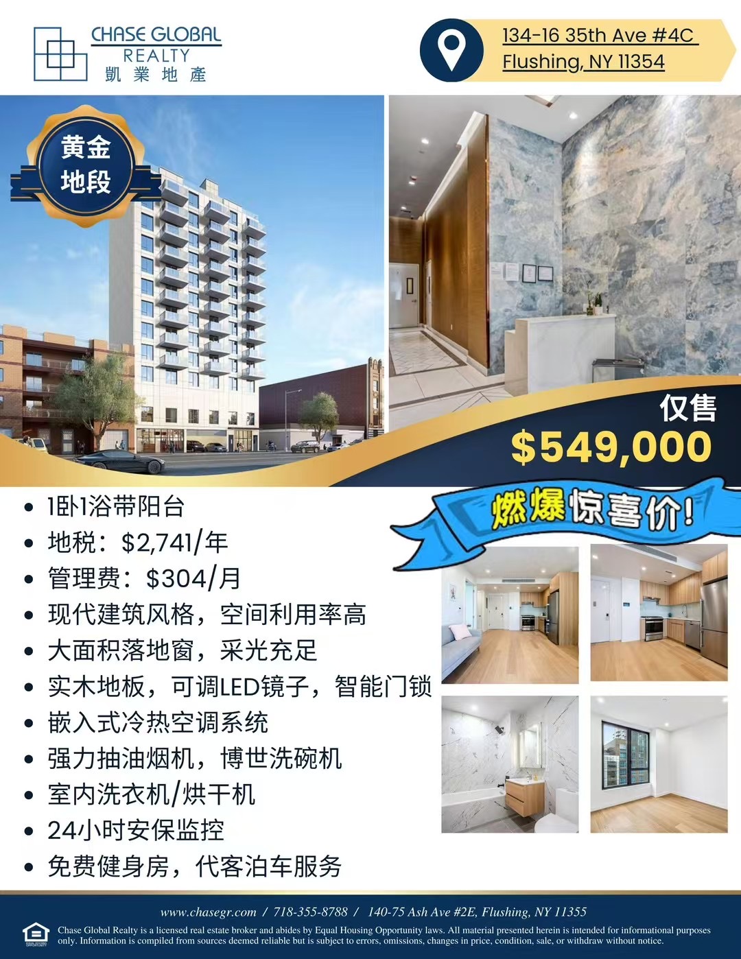 📍黄金坐标:134-16 35th Ave, Flushing NY 💲超值定价:$549,000 一卧一卫 HOA:$304.11/月 | 地税:$229/月支出约$535/月 ,租金可达$2,600/月