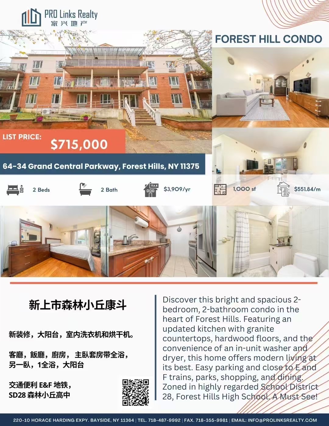 主臥套房带全浴,另一臥,1全浴,大阳台🚌交通便利 E&F 地铁🏫 SD28 森林小丘高中🏠64-34 Grand Central Parkway Forest Hills NY 11375