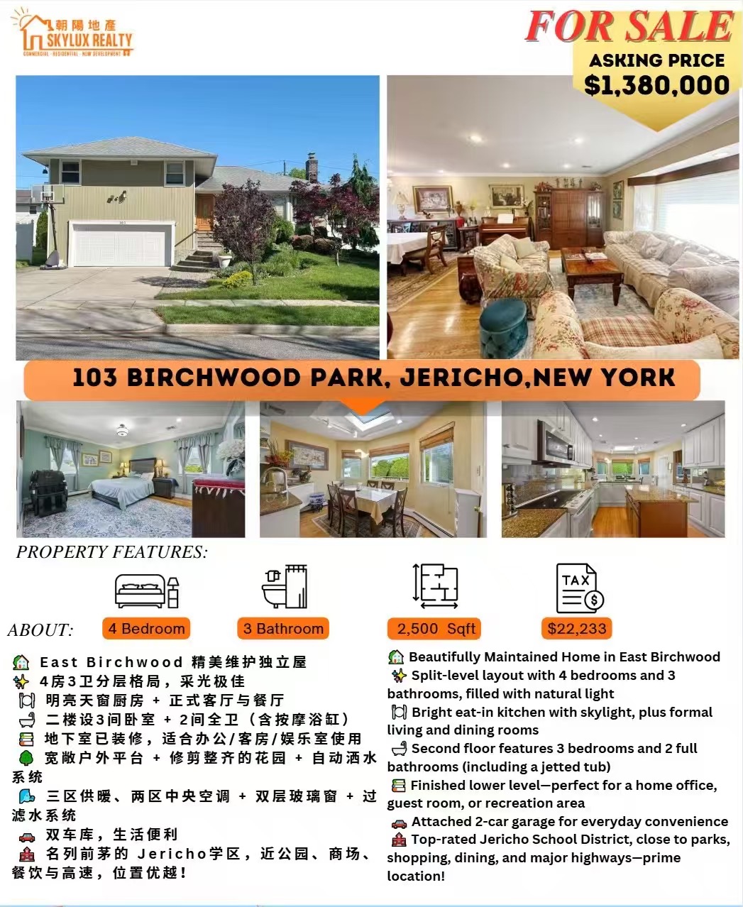 [太阳][太阳]🥇🥇新上市 ,[Fireworks][Fireworks] 这是一栋维护良好的4卧3卫分层住宅 Jericho 坐落于备受青睐的 East Birchwood 社区 售价138万