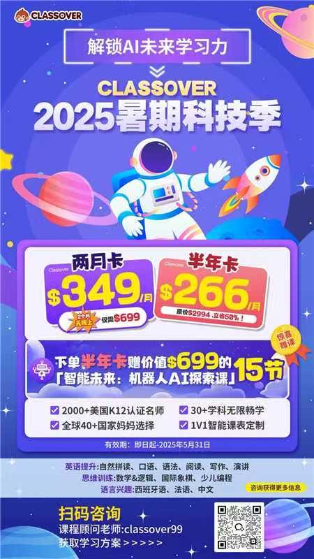Classover现在推出了暑期2月卡,专为放假时间设计,课程安排灵活,假期在家也能轻松上课~另外,半年卡限时8折中!现在只要$1596(原价$1996),