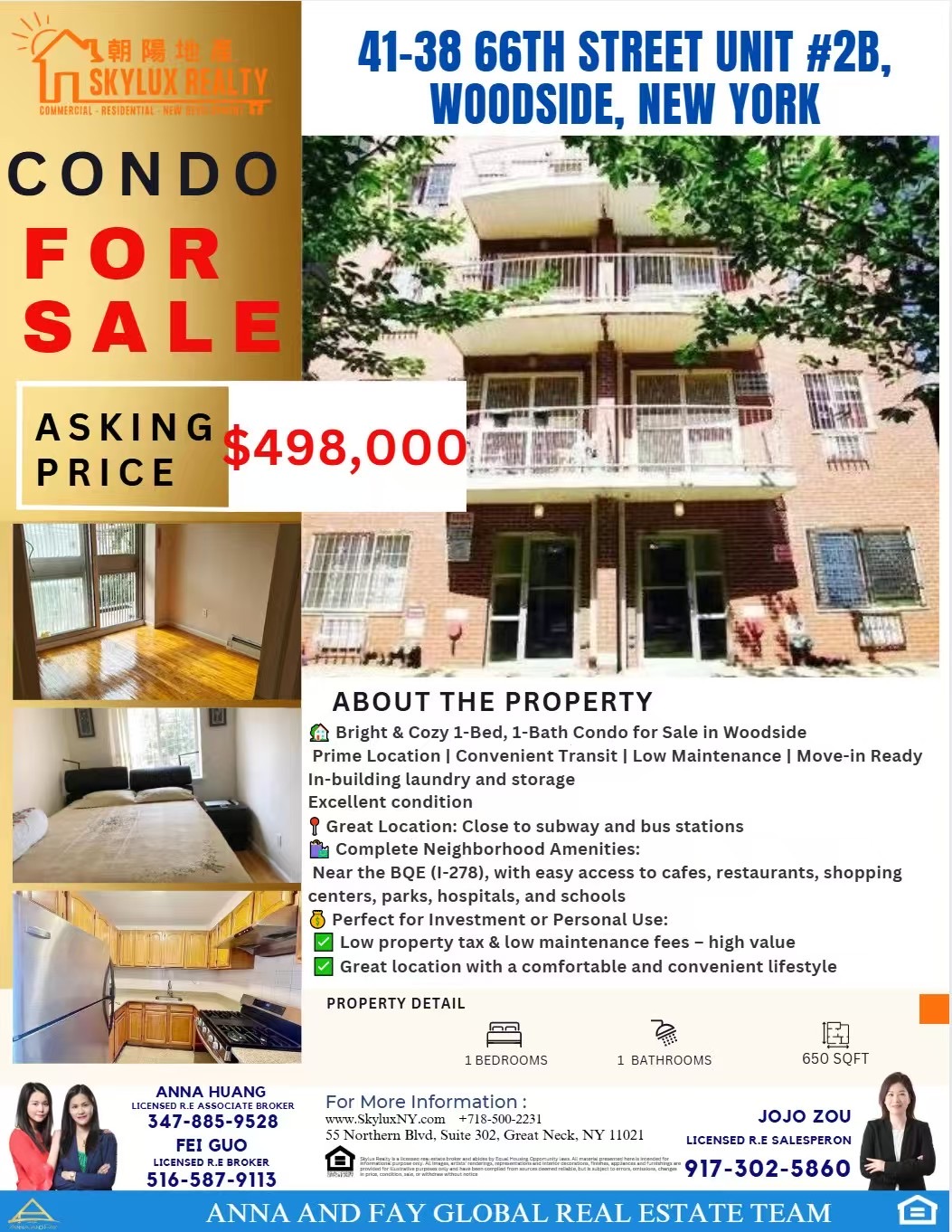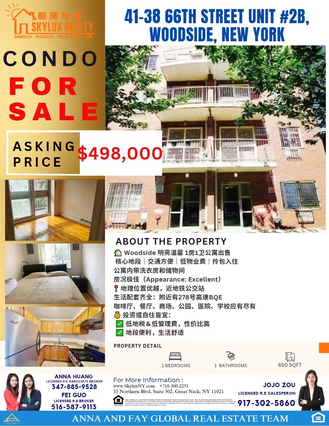 皇后区房子出售🏡 Woodside 明亮温馨 1房1卫公寓出售,要价49.8万