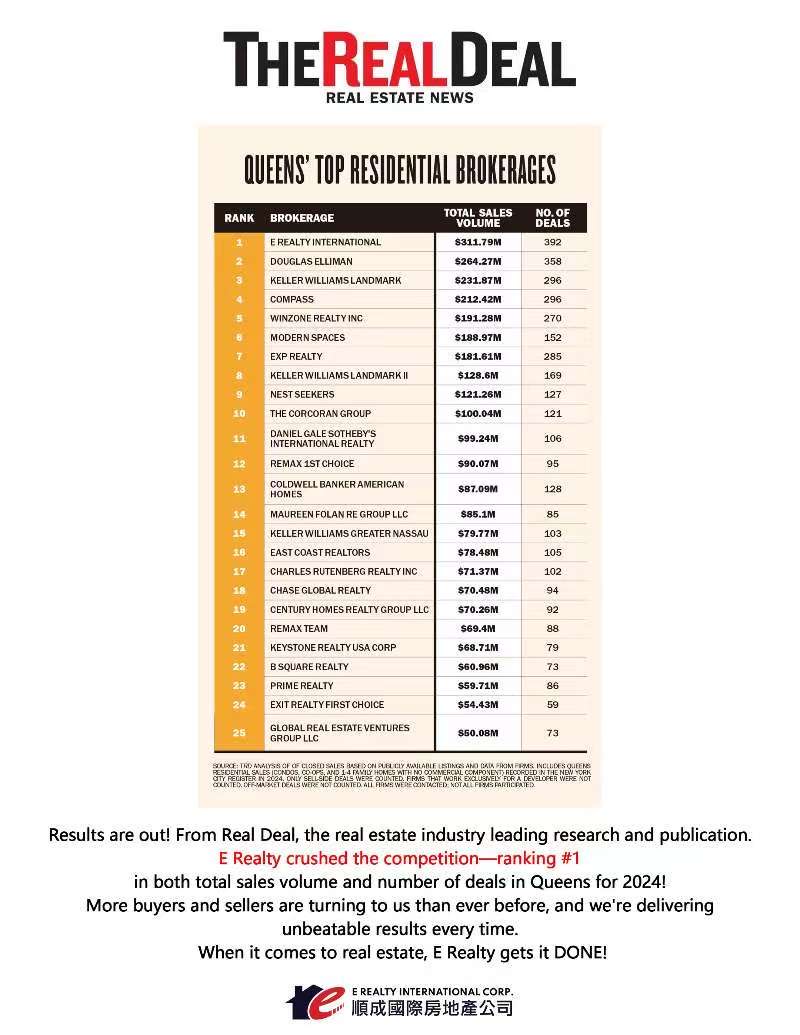 顺成国际房地产 E Realty Int’l Corp🎉 结果公布啦!来自房地产行业权威研究与出版机构《The Real Deal》的年度榜单重磅出炉!2024年皇后区房产中介排名揭晓——顺成国际房地产以总销售额&成交总量双料冠军!越来越多的买家和卖家选择我们,我们也不断交出令人惊艳的成绩单。在房地产领域,顺成就是高效、可靠的代名词!