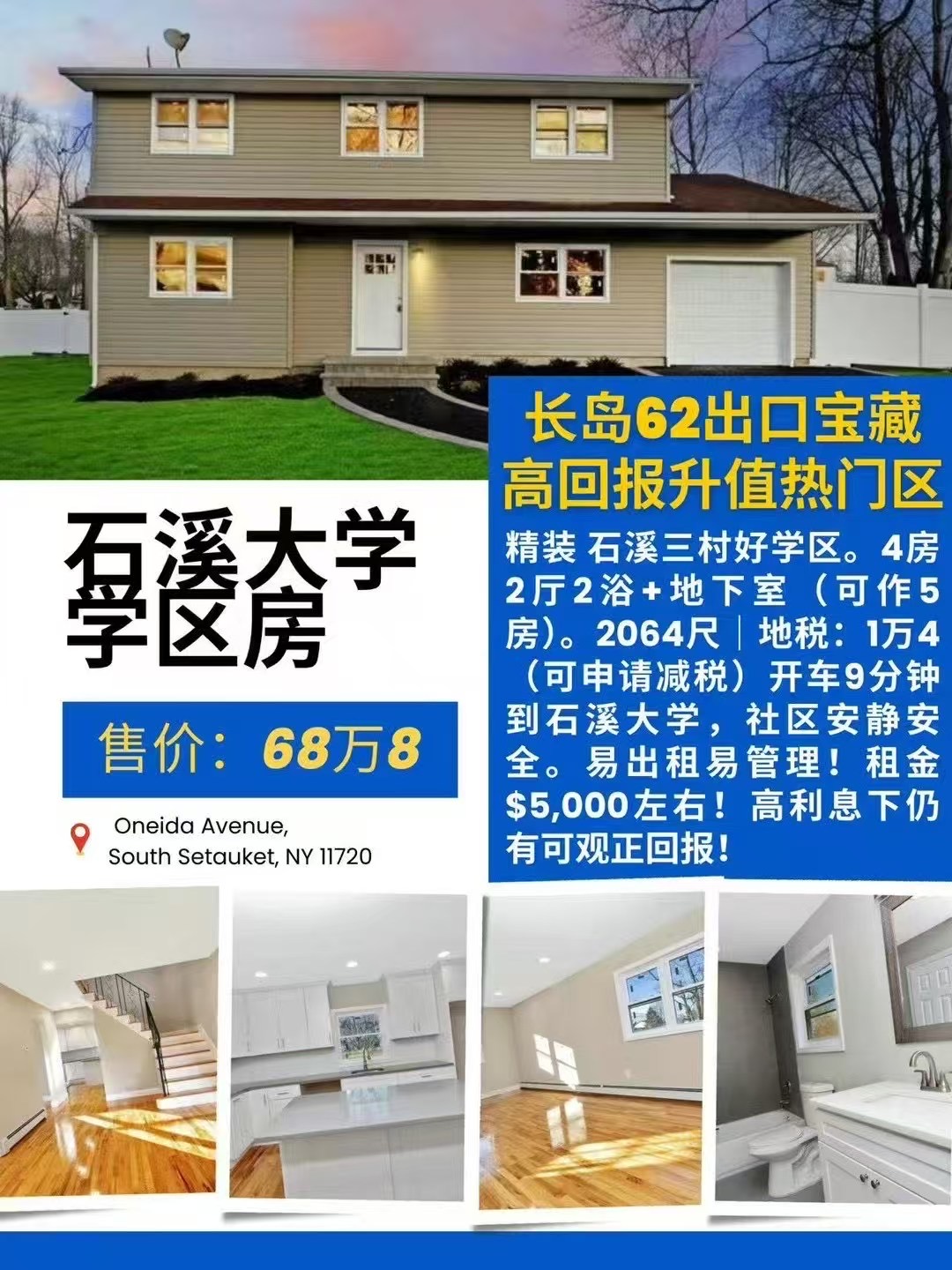 ☀️长岛石溪62出口宝藏高回报升值热门区‼️🤩升值空间巨大:精装石溪三村优质学区。4房2厅2浴+地下室(可作5房)。📐2064尺|地税:1万4(可申请减税)开车9分钟到石溪大学,社区安静安全。易出租易管理!租金 $5,000左右!高利息下仍有可观正回报!已清空,随时看房。