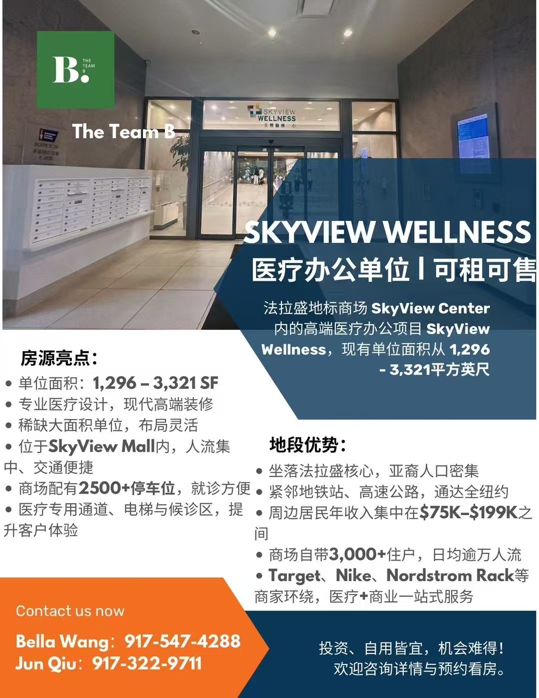 法拉盛地标商场 SkyView Center 内的高端医疗办公项目 SkyView Wellness,现有单位面积从 1,296 - 3,321平方英尺,