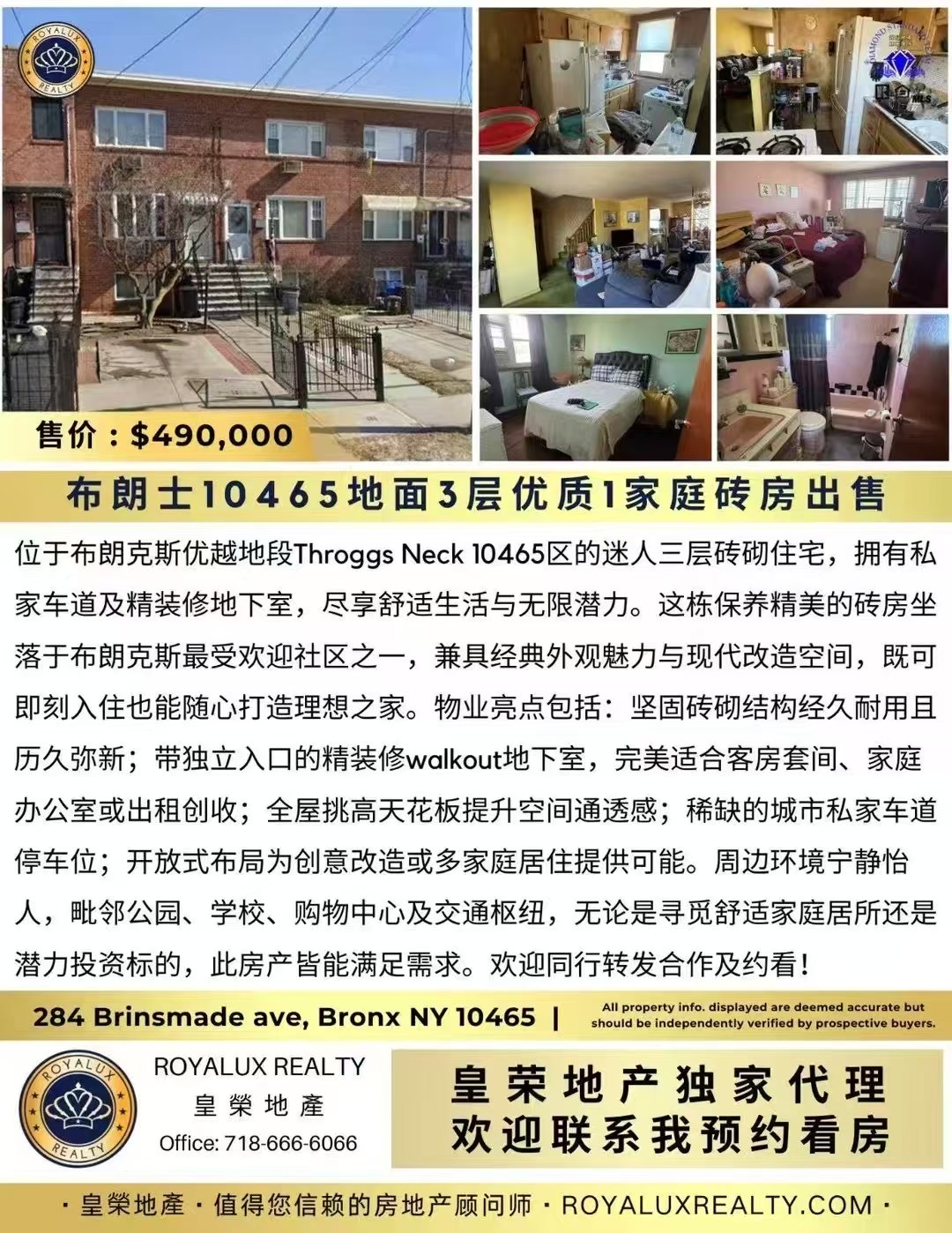 位于布朗克斯优越地段Throggs Neck 10465区的迷人三层砖砌住宅,拥有私家车道及精装修地下室,尽享舒适生活与无限潜力。这栋保养精美的砖房坐落于布朗克斯最受欢迎社区之一,兼具经典外观魅力与现代改造空间,既可即刻入住也能随心打造理想之家。物业亮点包括:坚固砖砌结构经久耐用且历久弥新;带独立入口的精装修walkout地下室,完美适合客房套间、家庭办公室或出租创收;全屋挑高天花板提升空间通透感;稀缺的城市私家车道停车位;开放式布局为创意改造或多家庭居住提供可能。周边环境宁静怡人,毗邻公园、学校、购物中心及交通枢纽,无论是寻觅舒适家庭居所还是潜力投资标的,此房产皆能满足需求。欢迎同行转发合作及约看!
