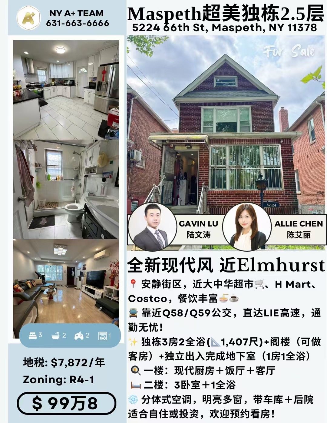 ✨🏡 Maspeth山顶近Elmhurst超美独栋2.5层+✅独立出入口完成地下室出售|99万8