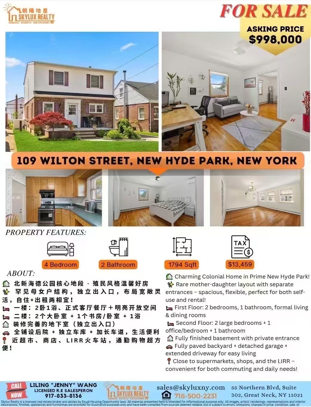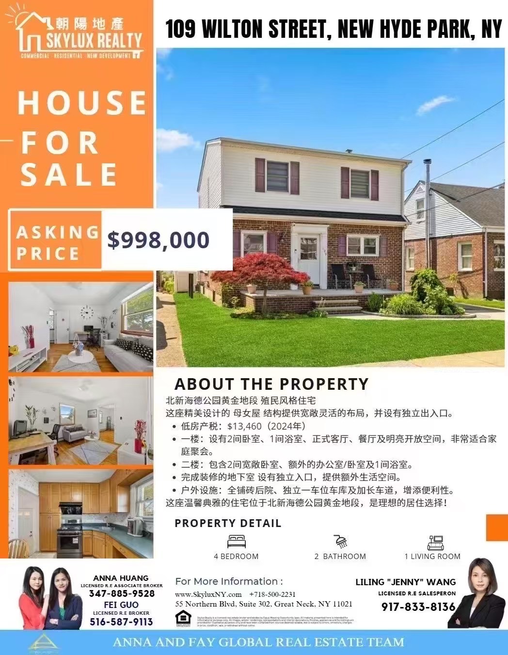 长岛独栋房屋出售 富人区安静街区 居住舒适度高长岛华人区房屋出售 人气社区 稀有上市 房源有限[太阳][太阳]🥇🥇周日2:30-4:30新上市 新海德公园黄金地段的殖民风格住宅,设计精美,格局母女屋,布局宽敞灵活且拥有独立出入口。$99.8万地4000 屋1800 4房2浴➕办公室 可以分前后居住 一楼设有两间卧室、一间浴室、正式的客厅、餐厅以及适合家庭聚会的明亮开放空间
