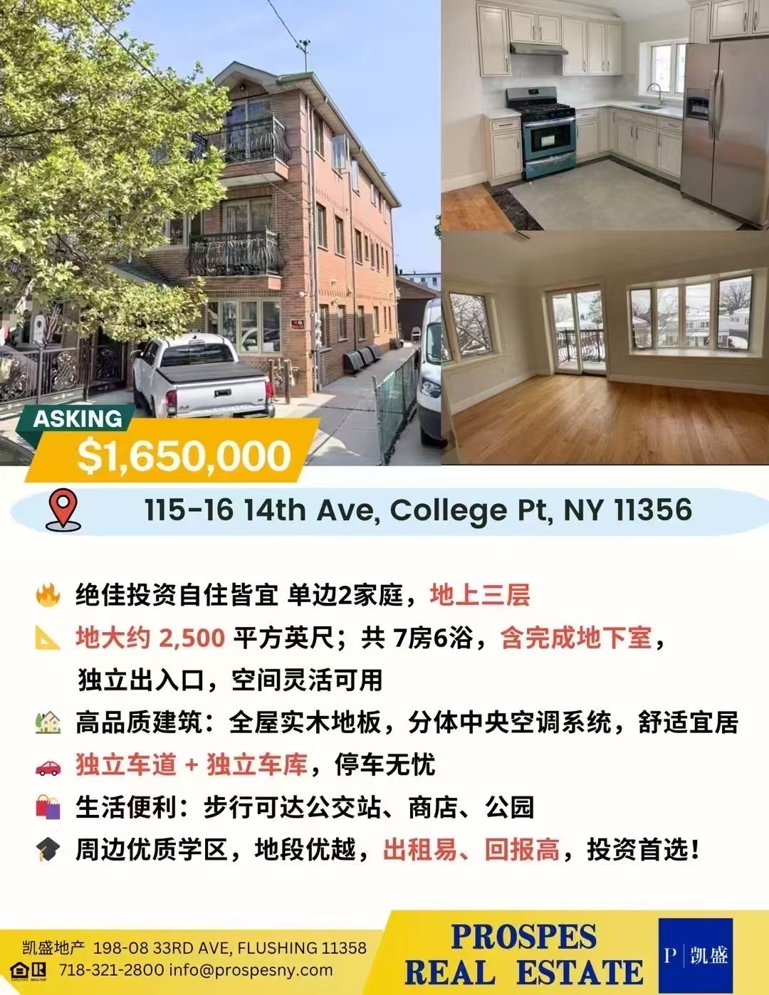 🏡 新上市,凯盛地产独家代理 🏡🐾【College Point 全砖两家庭住宅】投资自住皆宜!📍 地址:115-16 14th Ave, College Point, NY 11356