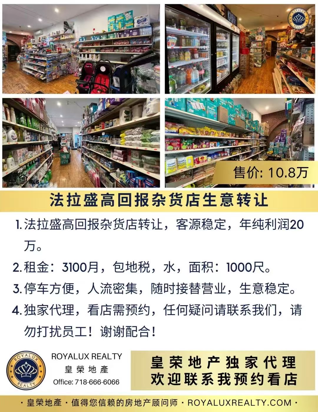 【新上市】皇荣地产独家代理生意买卖🎖️法拉盛高回报杂货店生意转让| 售价10.8万🎖️生意介绍:1.法拉盛高回报杂货店转让,客源稳定,年纯利润20万。2.租金:3100月,包地税,水,面积:1000尺。3.停车方便,人流密集,随时接替营业,生意稳定。4.独家代理,看店需预约,任何疑问请联系我们,请勿打扰员工!谢谢配合!📲3478795615