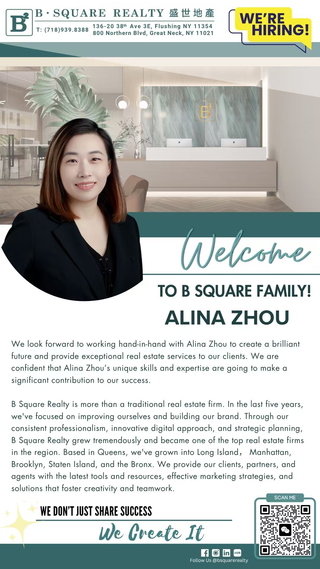 盛世地产欢迎Alina Zhou加入B Square Realty,开启她的房地产事业新篇章。与盛世精英,共同创造非凡未来。B Square Realty,一个不断创新、专注成长的房地产领航者,覆盖纽约多个区域,提供前沿的工具和资源,助您成就业务卓越。