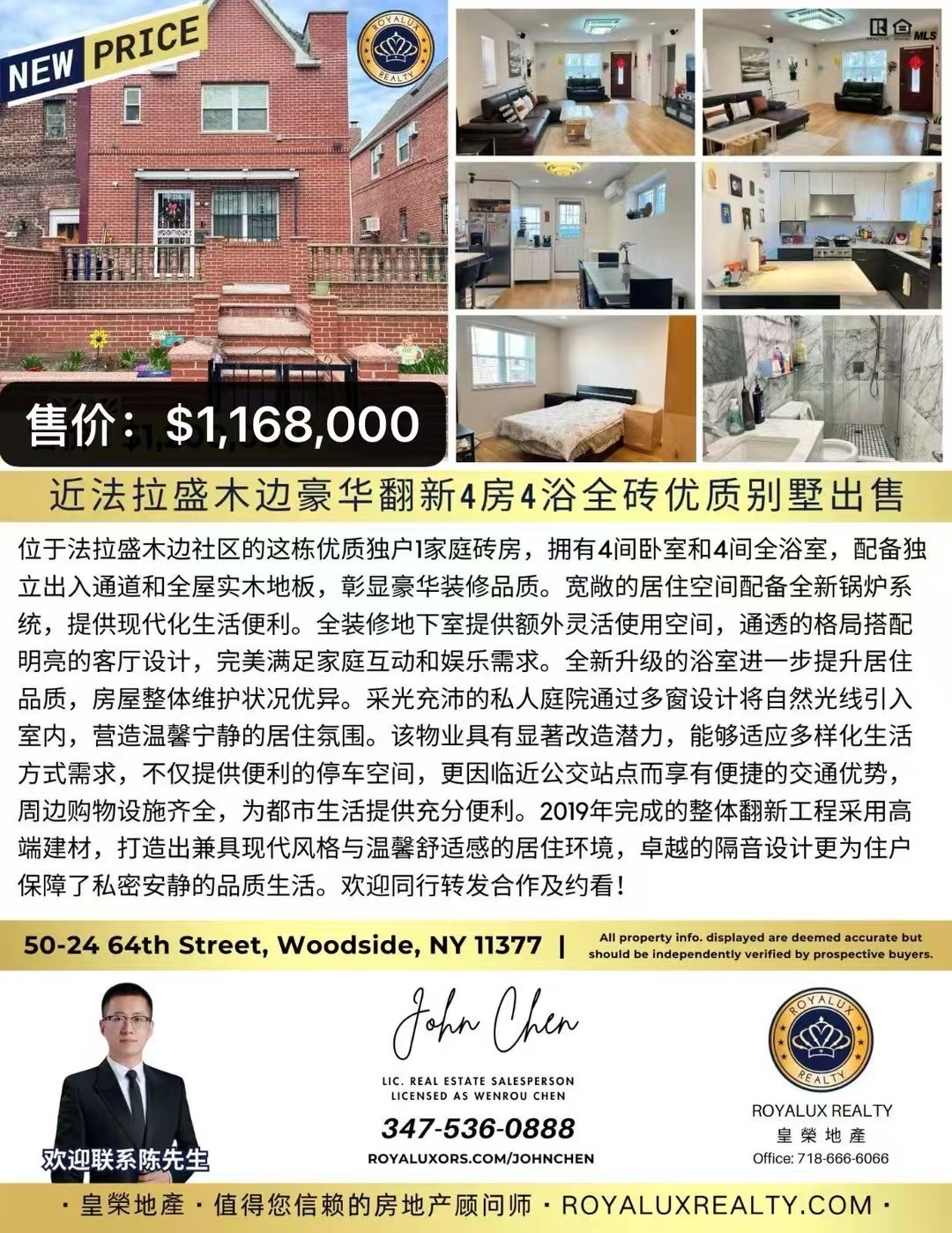 皇后区房产出售 Queens NY 最新房屋买卖信息大全 包含独立屋公寓学区房首次购房投资推荐新调整价格:$1,168,000 欢迎合作转发🏡 Woodside R4B 全砖结构单边一家庭(可轻松改为合法两家庭)本物业于2019年进行了全面翻新,不仅包括所有肉眼可见区域(如地板、墙面、厨房、浴室等),更覆盖墙体内部的隐蔽工程 —— 全屋水管与电线全部升级,实现真正的内外焕新。翻新过程采用高端材料,施工规范,品质卓越。
