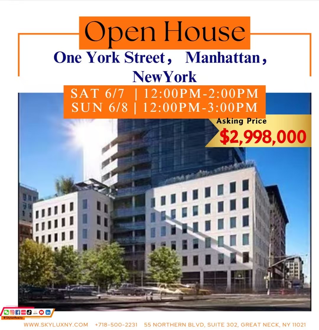 曼哈顿顶级豪华康斗出售 临近中央公园 生活便利曼哈顿核心区豪华康斗出售 学区好 配套完善 升值潜力强One York Street 位于Soho与Tribeca交汇处的时尚精品公寓 要價2998,000 地稅1770 管理費2295 这套公寓由著名建筑师Enrique Norten设计,精致典雅,地理位置优越。该单位为宽敞的两室两浴公寓,面积达1530平方英尺。客厅/餐厅开阔通透,采用开放式厨房设计,并拥有北向全景视野,可一直远眺至中城,全天沐浴在充足的自然光线中。