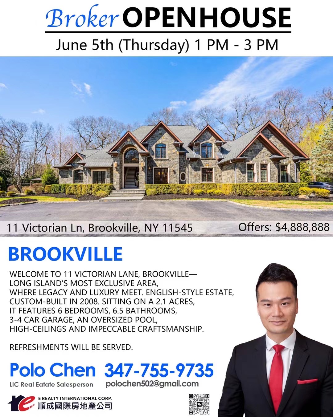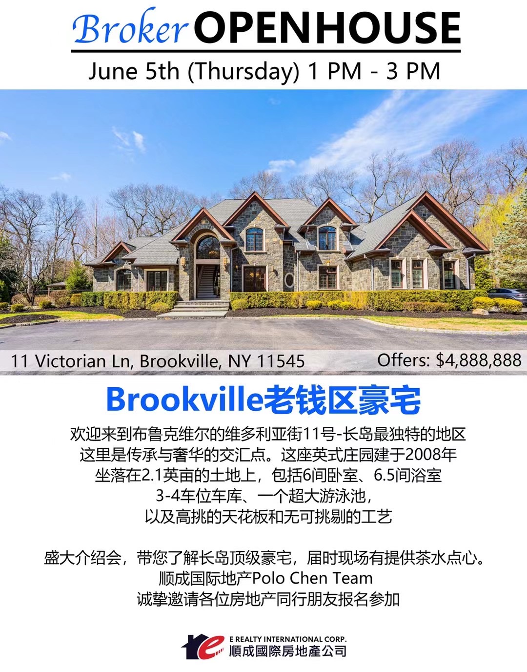法拉盛地产公司盛大介绍会,带您了解长岛顶级豪宅,届时现场有提供茶水点心。顺成国际地产Polo Chen Team 诚挚邀请各位房地产同行朋友报名参加!🌟Broker Open House🌟6/5/25 Thursday 1 PM - 3 PM11 Victorian Ln, Brookville, NY 11545Offers: $4,888,888Brookville 老钱区豪宅 ( 客戶想看也可聯繫我們)