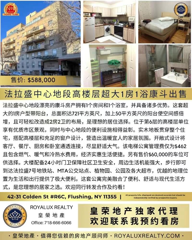 新上市🏠法拉盛黄金地段超大一房康斗Condo58万8(易改2房2浴)🧨🧨近植物园,投资自住首选,易租满租地段🔥🔥💎实用721尺+50尺阳台💎朝向好釆光通透,多窗明亮💎 格局方正,全屋实木地板💎电梯公寓,高楼层视野好💎超低管理费$462除电全包(暖气燃气,冷热水),低地税仅$374/月,分体空调💎24小时门卫,收包裹安全有保障💎另有独立产权地下车位6万可选购💎步行至7号地铁站,2分钟至缅街周围餐厅、银行、商场、超市等一条街