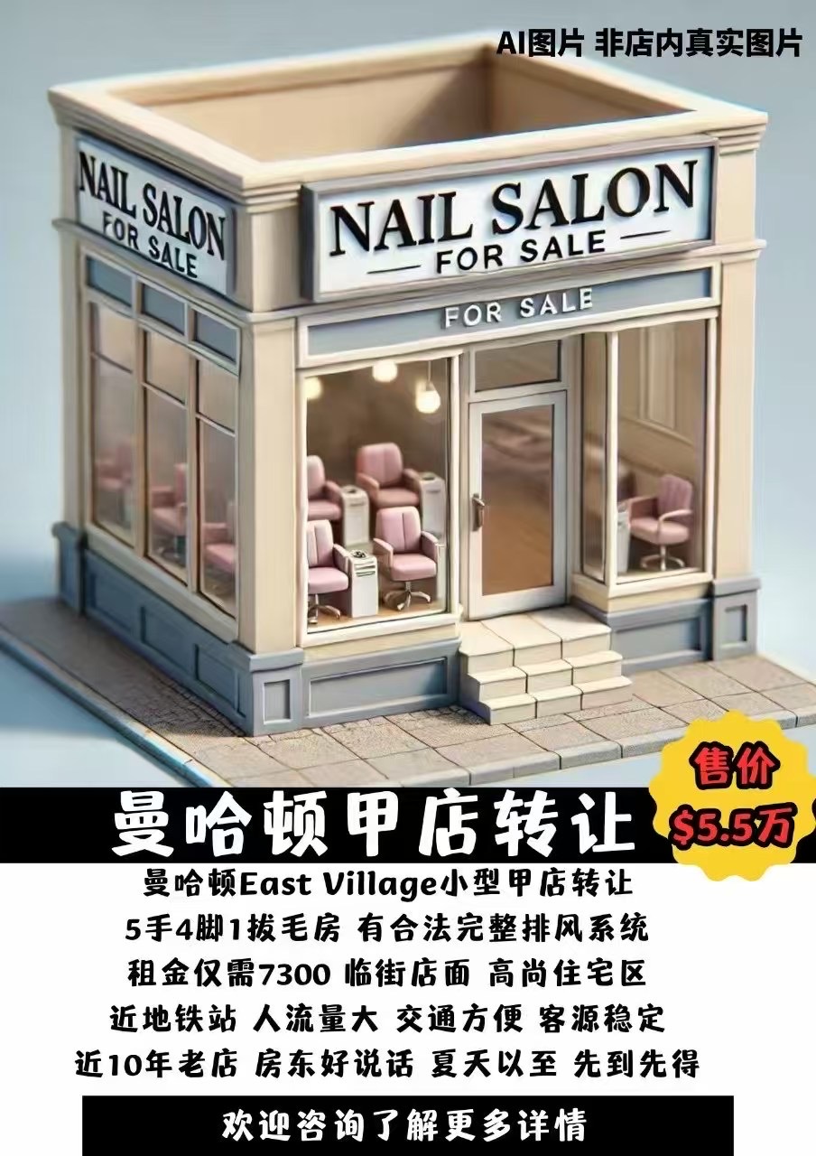 独家代理欢迎合作转发曼哈顿East Village小型甲店转让当街店面,有5台4池,一间拔毛房和一间员工休息室目前租金7300左右(房东好说话,可议)有合法排风系统,近10年老店,有稳定的客人高档住宅区,近地铁站,人流量大卖家因私人原因诚意转让,可帮忙交接过渡转让费:5万5☎️9178688823 Brynn