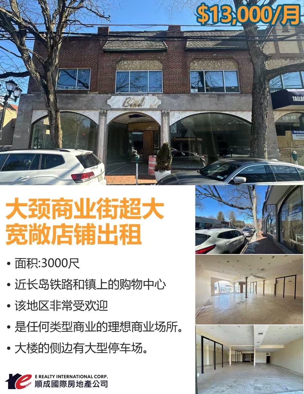 🔥租金: $13,000/月🔥大颈商业街超大宽敞店铺出租🌟面积:3000尺🌟近长岛铁路和镇上的购物中心🌟该地区非常受欢迎🌟是任何类型商业的理想商业场所。🌟大楼的侧边有大型停车场。