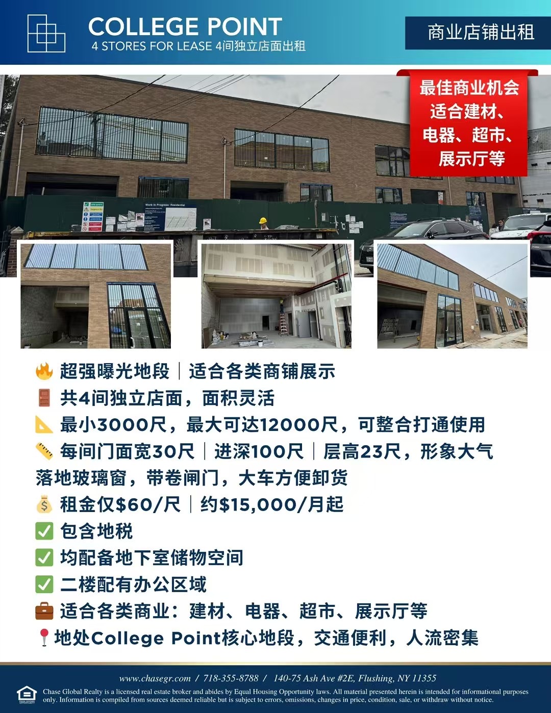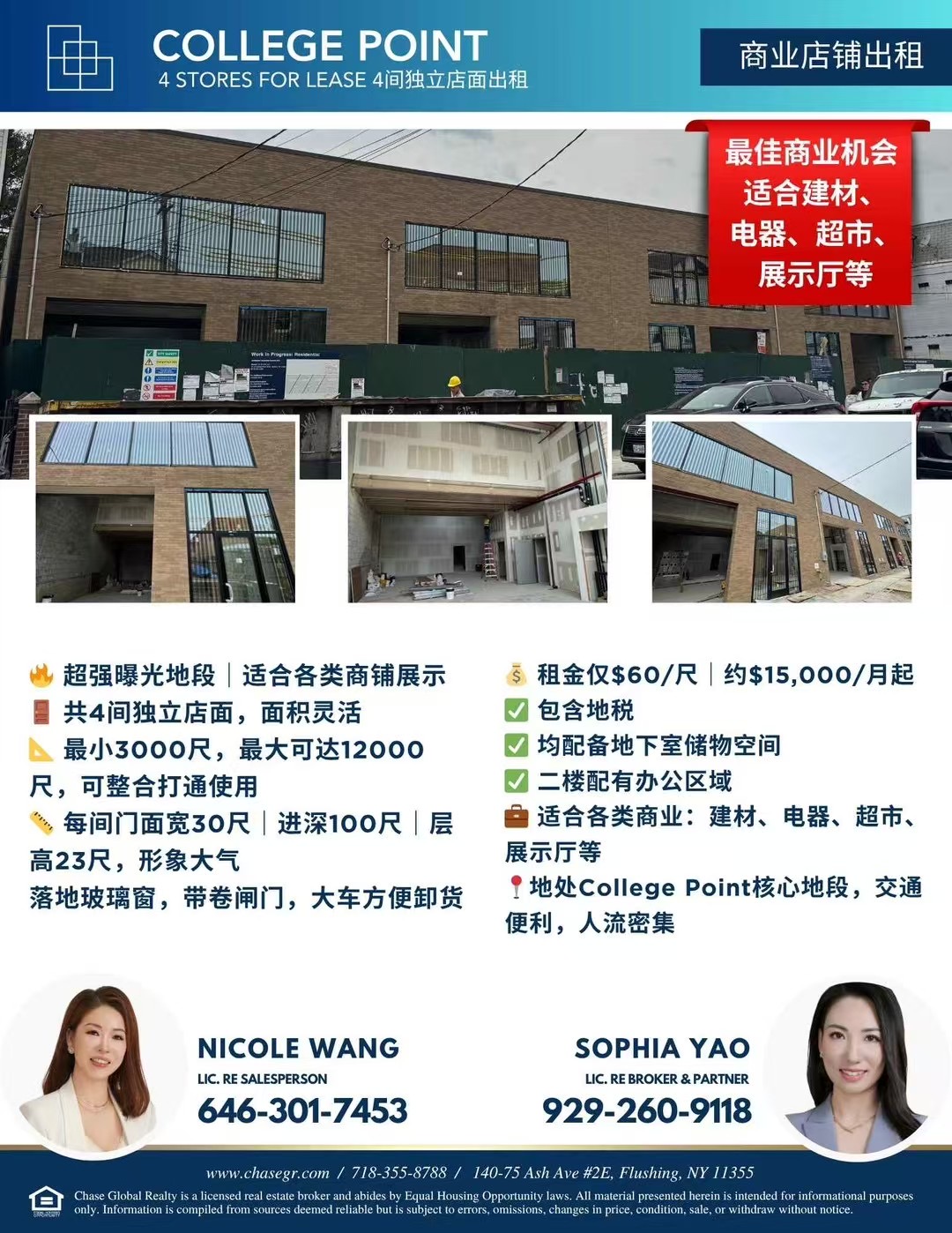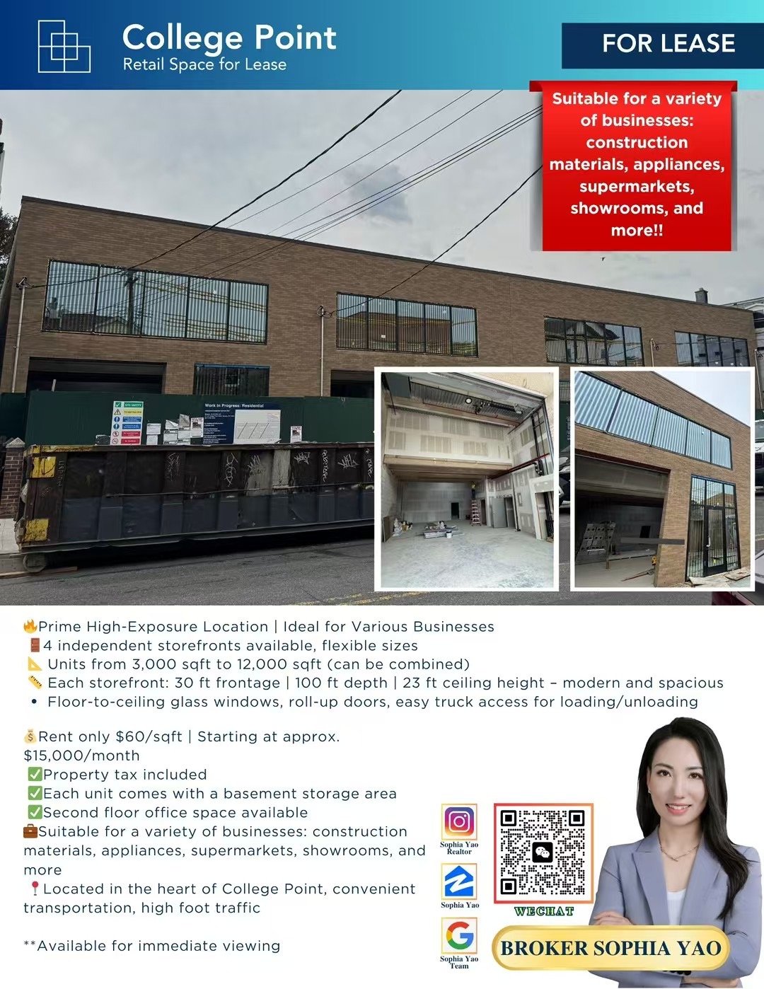 📢【大学点中心·商业店面出租】🔥 超强曝光地段|适合各类商铺展示🚪 共4间独立店面,面积灵活📐 最小3000尺,最大可达12000尺,可整合打通使用📏 每间门面宽30尺|进深100尺|层高23尺,形象大气[礼物]落地玻璃窗,带卷闸门,大车方便卸货💰 租金仅$60/尺|约$15,000/月起✅ 包含地税✅ 均配备地下室储物空间✅ 二楼配有办公区域💼 适合各类商业:建材、电器、超市、展示厅等📍地处College Point核心地段,交通便利,人流密集📲 随时可看|欢迎合作! 凯业地产Sophia Yao 929-260-9118