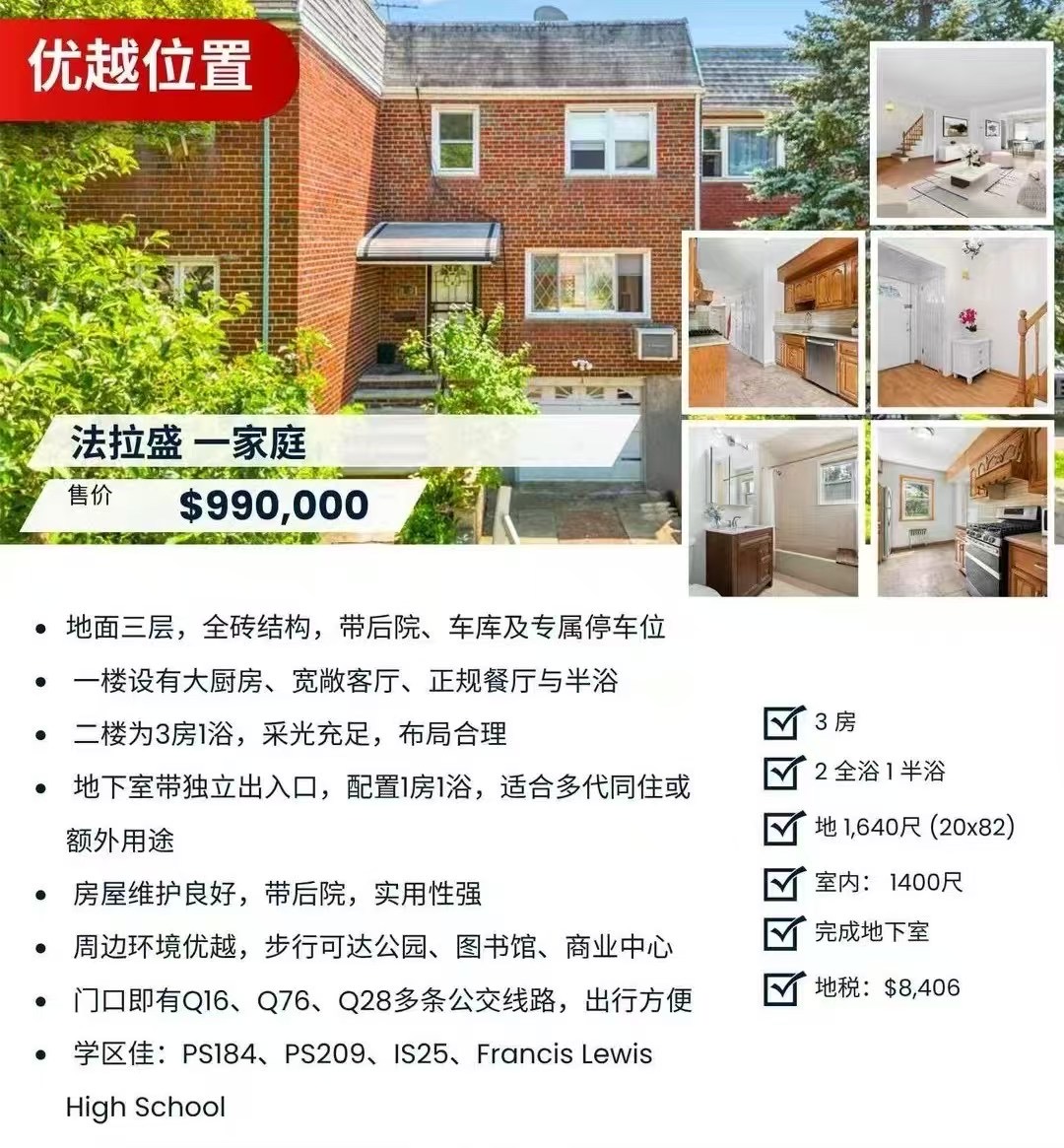 全新上市北法拉盛近白石镇|联排一家庭住宅|Zoning R4🔸售价$99万