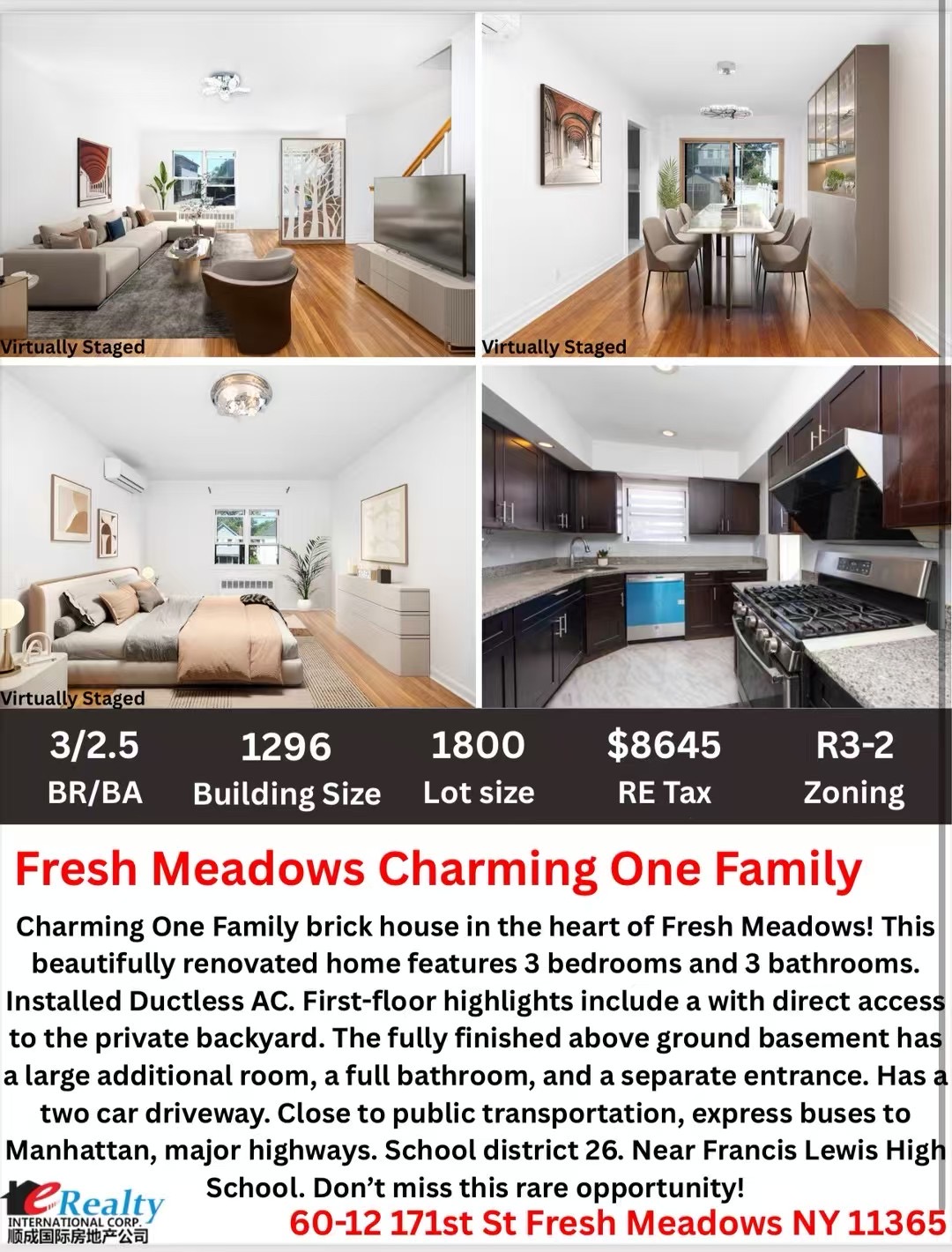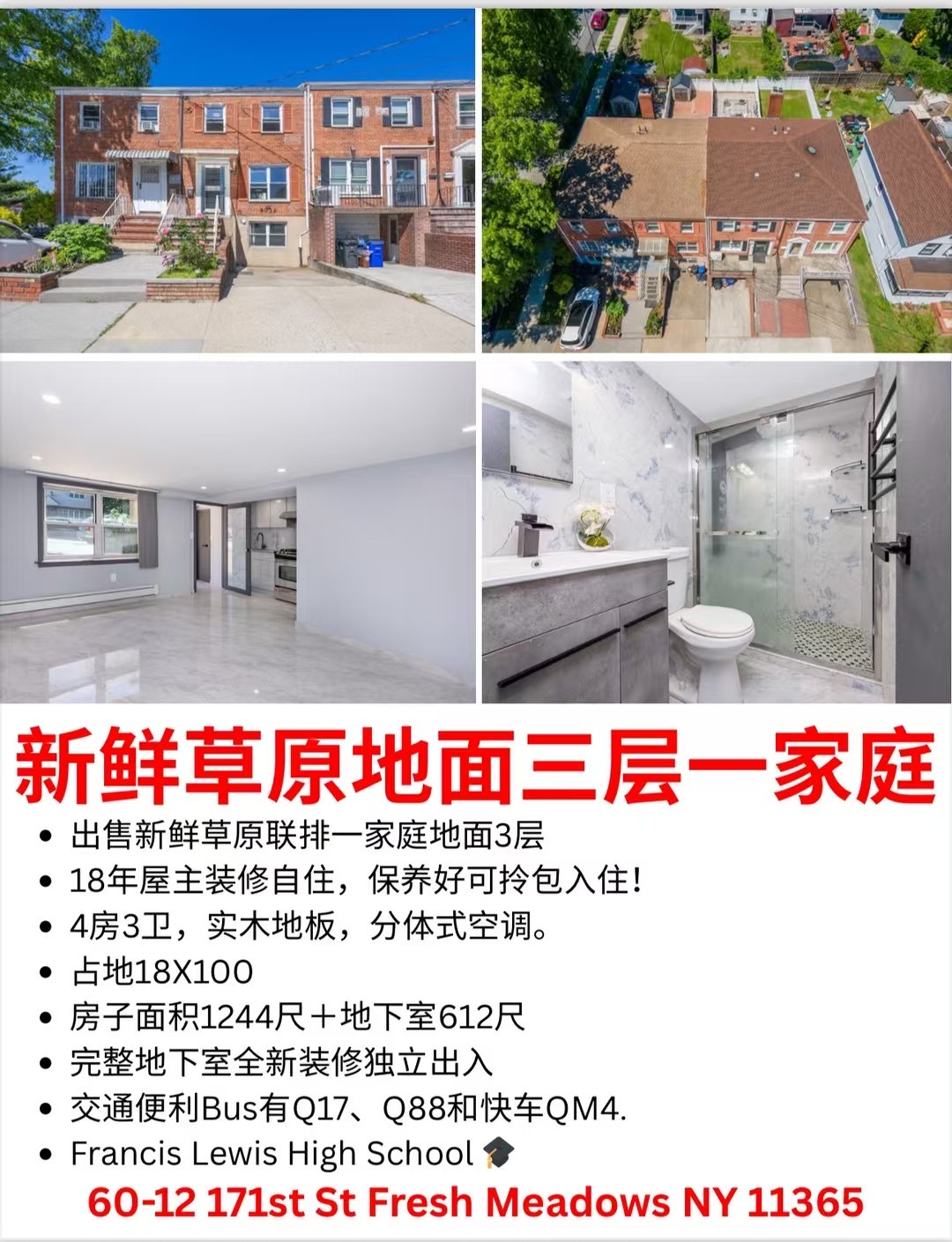 🎈明天早上11:30可以看,需预约✅🏠地址:60-12 171st St Fresh Meadows NY 11365🏠出售新鲜草原联排一家庭地面3层🧱18年屋主装修自住,保养好可拎包入住!🛌4房3卫,实木地板,分体式空调。📏占地18X100📏房子面积1244尺+地下室612尺🚪完整地下室全新装修独立出入🚍交通便利Bus有Q17、Q88和快车QM4.🎓Francis Lewis High School 🎓 🧮Zoning R3-2