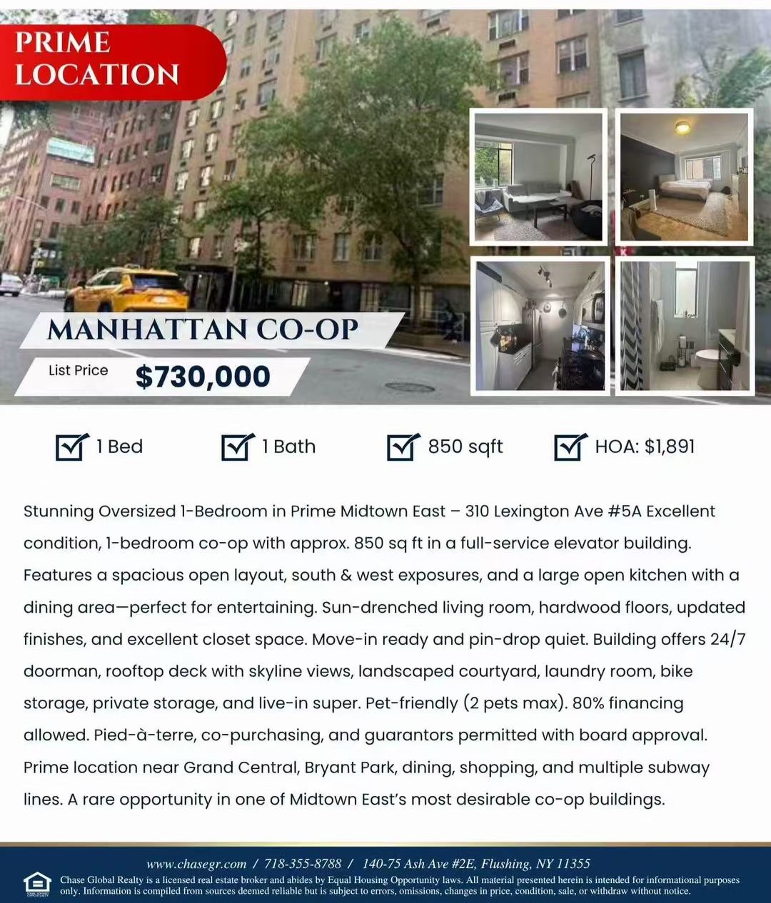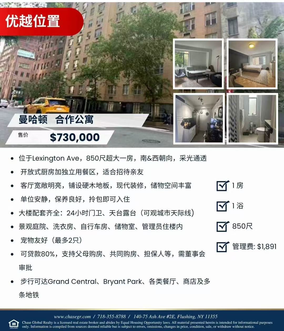 🔥🔥曼哈顿Midtown East超大1房Co-op出售$73万🔸每月管理费$1,891🔹位于Lexington Ave|850尺超大一房|南&西朝向采光充足🔹开放式厨房+独立用餐区,适合招待亲友🔹客厅宽敞明亮,硬木地板,现代装修,储物空间丰富🔹单位安静、保养良好,拎包入住🔹大楼配套齐全:24小时门卫、天台露台(可观城市天际线)、景观庭院、洗衣房、自行车房、储物室、管理员住楼内🔹宠物友好(最多2只)🔹可贷款80%,支持父母购房、共同购房、担保人等,需董事会审批🔹步行可达Grand Central、Bryant Park、各类餐厅、商店及多条地铁