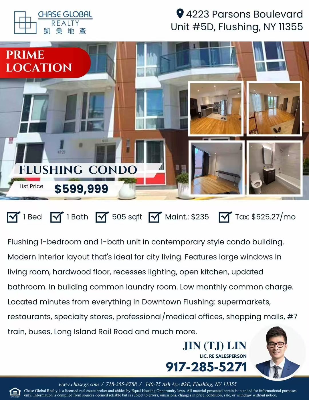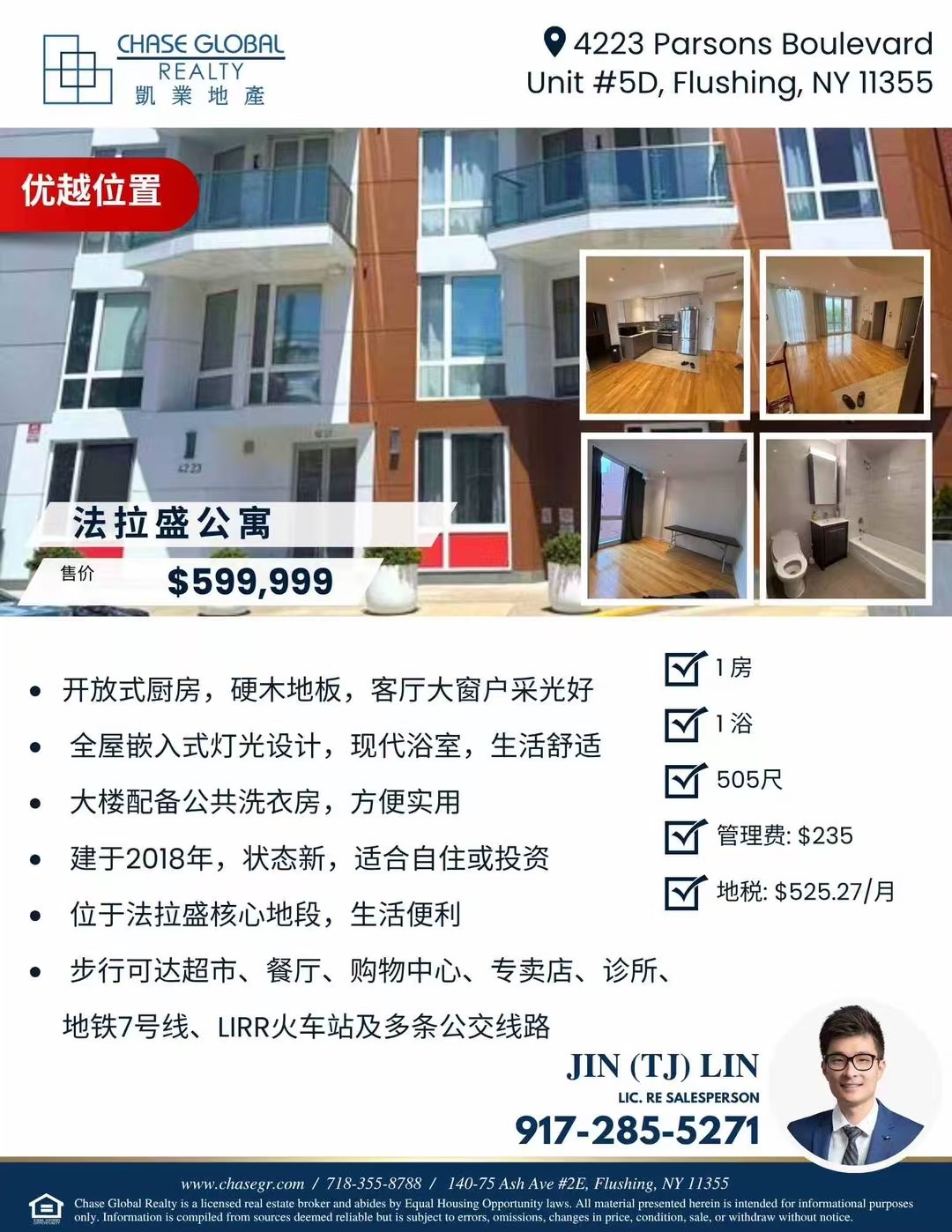 法拉盛🔥Flushing现代公寓1房1浴出售$59.9万🔸每月管理费$235,年地税$6,303🔹室内约505尺,1房1浴,现代简约设计🔹开放式厨房,硬木地板,客厅大窗户采光好🔹全屋嵌入式灯光设计,现代浴室,生活舒适🔹大楼配备公共洗衣房,方便实用🔹建于2018年,状态新,适合自住或投资🔹位于法拉盛核心地段,生活便利🔹步行可达超市、餐厅、购物中心、专卖店、诊所、地铁7号线、LIRR火车站及多条公交线路📍地址:4223 Parsons Boulevard Unit #5D, Flushing, NY 11355📲请联系凯业地产 Jin (TJ) Lin 917-285-5271