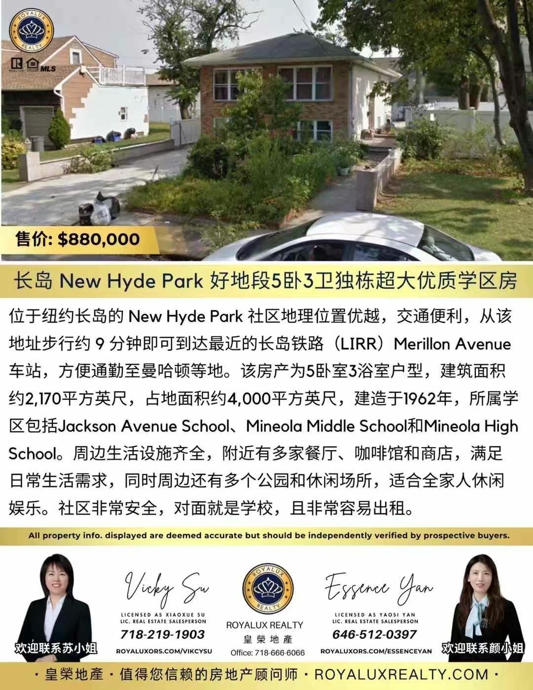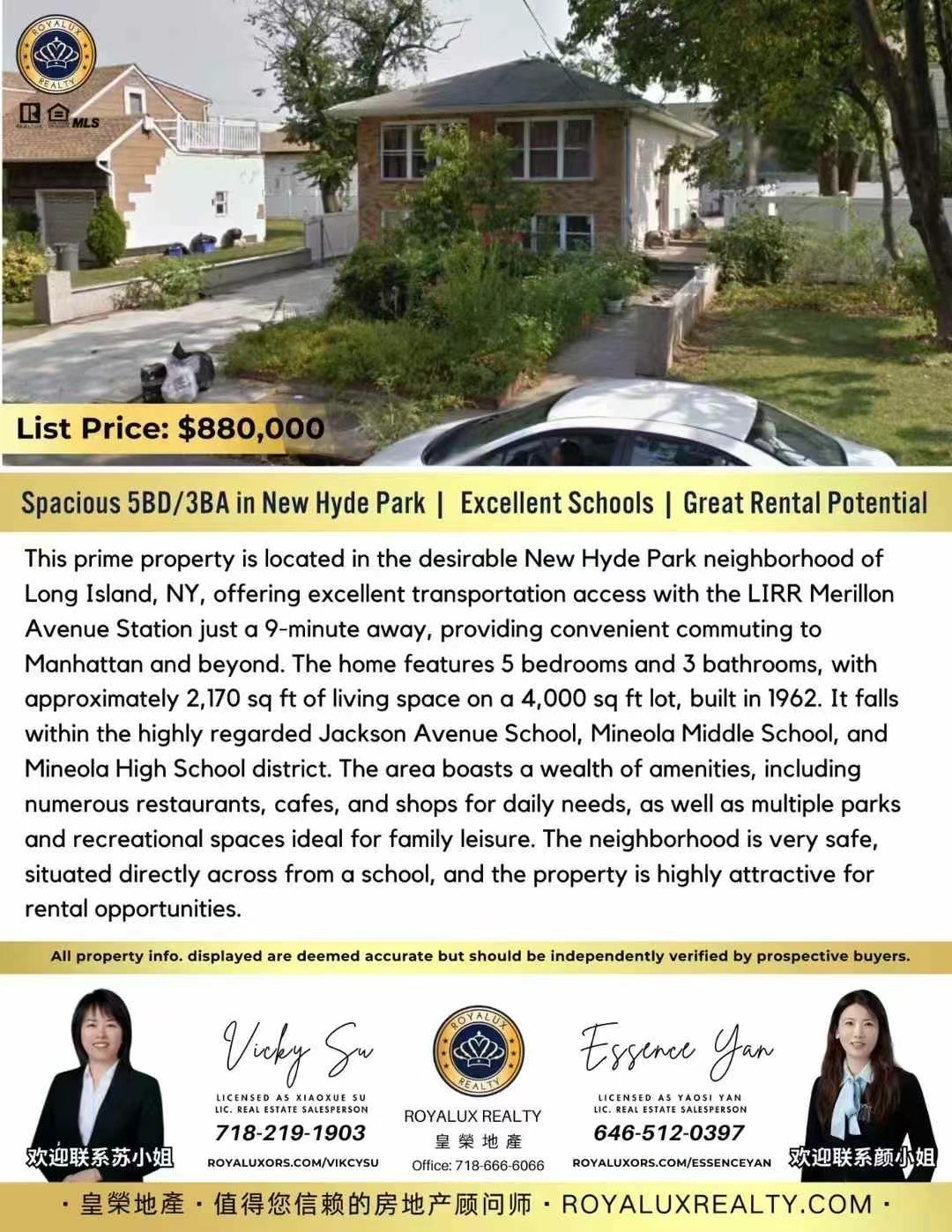 🏡 独家好房推荐 | 长岛 New Hyde Park 独栋学区房🔥 5卧3卫 · 超大空间 · 黄金学区 · 仅售 $88万!📍 地段优越 · 生活方便 · 对面就是学校!✅ 步行9分钟到LIRR火车站(Merillon Ave),直达曼哈顿✅ 安全社区,适合家庭居住,也超级好出租!