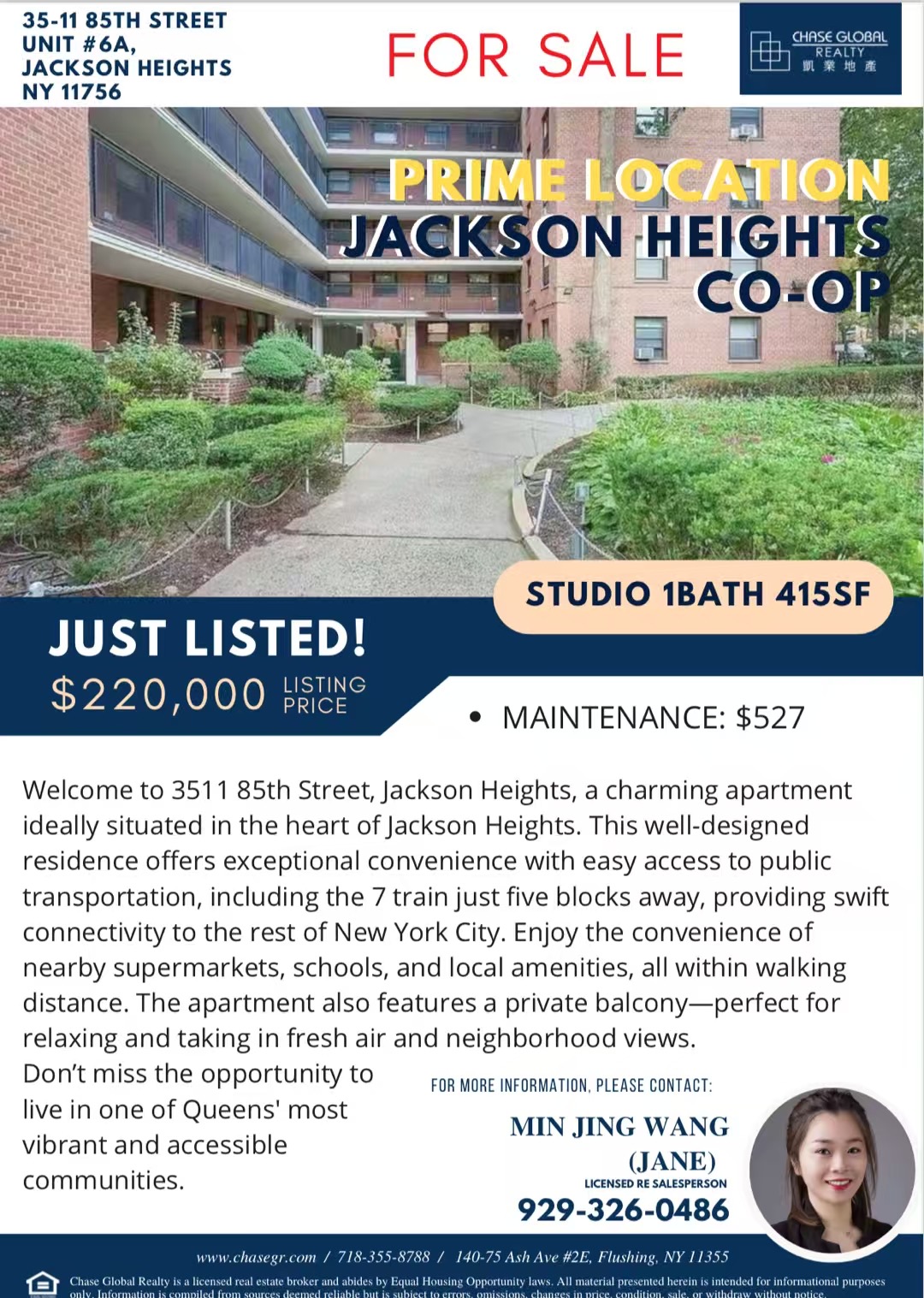 杰克逊高地公寓出售 华人区生活方便 交通直达曼哈顿Jackson Heights精装一房公寓出售 皇后区安静街区首选优越地段,位于JACKSON HEIGHTS核心地段,生活便利9 交通便捷,距离地铁7号线仅5个街区,快速通达纽约各区周边配套齐全,步行范围内有超市、学校和本地便利设施* 私人阳台,配备独立阳台,可休闲放松、欣赏社区景色生活氛围浓厚,位于皇后区最具活力和可达性的社区之一,宜居宜投资