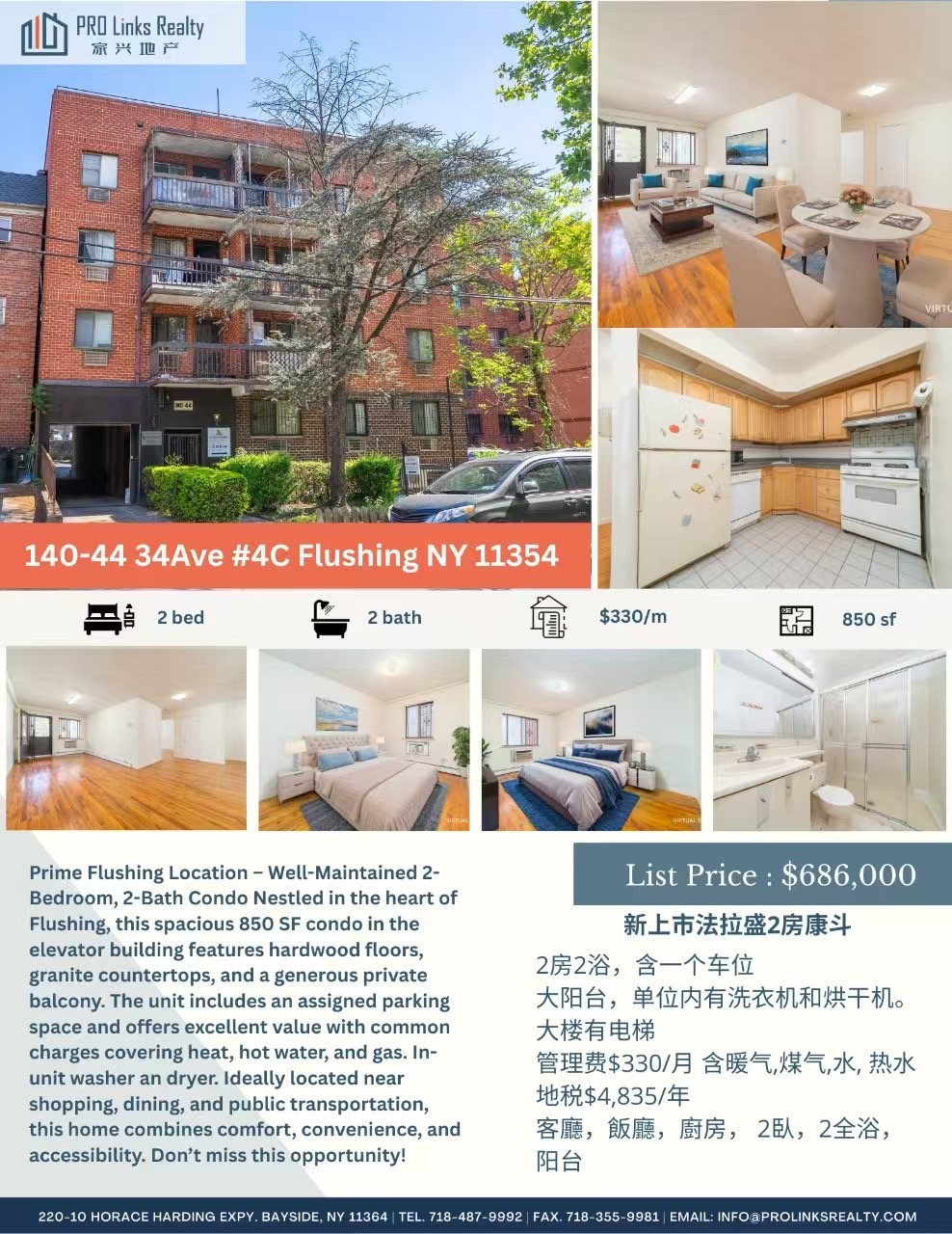 🎉新上市法拉盛2房康斗🎉2房2浴,🔹含一个车位🔹大阳台,单位内有洗衣机和烘干机。大楼有电梯管理费$330/月 含暖气,煤气,水, 热水地税$4,835/年🧧售$68万6🏠客廳,飯廳,廚房, 2臥,2全浴,大阳台🏠140-44 34th Ave unit 4C Flushing NY 11354👏欢迎合作转发☎️Lillian 刘 917-4188233☎️ Kaman 黎347-233-0888