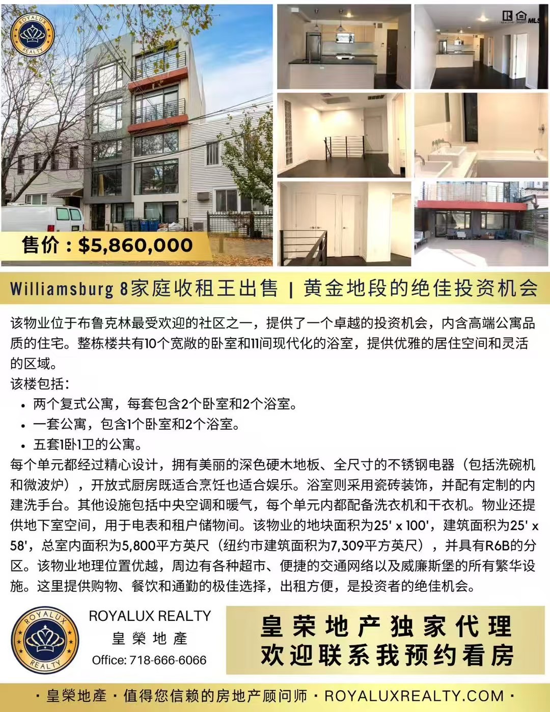 每个单元都经过精心设计,拥有美丽的深色硬木地板、全尺寸的不锈钢电器(包括洗碗机和微波炉),开放式厨房既适合烹饪也适合娱乐。浴室则采用瓷砖装饰,并配有定制的内建洗手台。其他设施包括中央空调和暖气,每个单元内都配备洗衣机和干衣机。物业还提供地下室空间,用于电表和租户储物间。该物业的地块面积为25’ ×100',建筑面积为25’×58',总室内面积为5,800平方英尺(纽约市建筑面积为7,309平方英尺),并具有R6B的分区。该物业地理位置优越,周边有各种超市、便捷的交通网络以及威廉斯堡的所有繁华设施。这里提供购物、餐饮和通勤的极佳选择,出租方便,是投资者的绝佳机会。