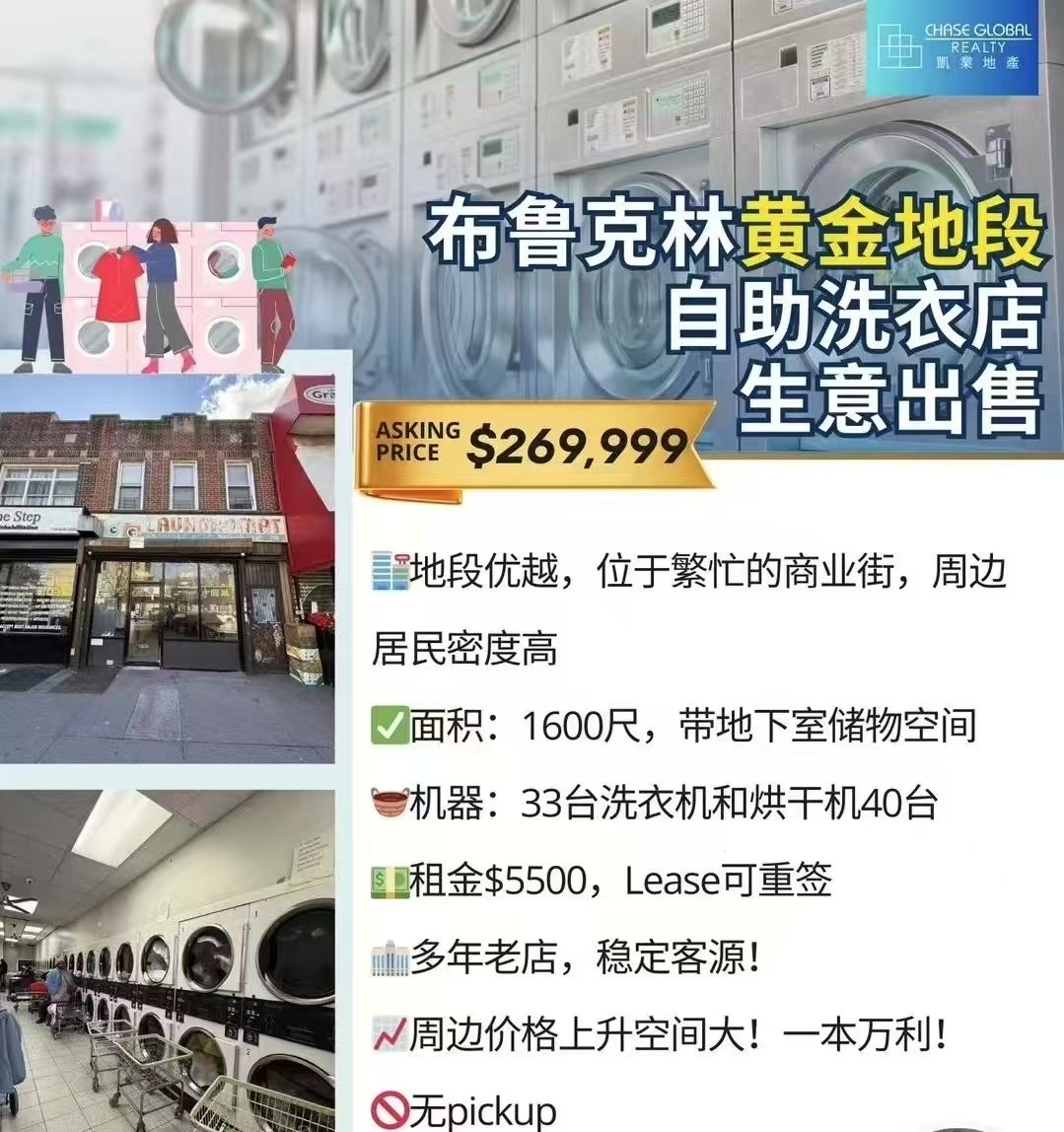 独家出售布鲁伦Church Ave多年自助洗衣店目前开价26.9万(🍎可议,接受灵活付款方式)面积;1600➕地下室,带Co✅设备;73台(机况一般)租金;5500,地税1万