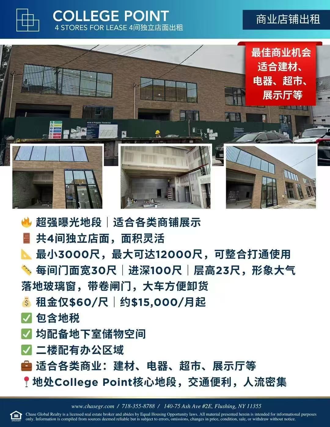 📢【大学点中心·商业店面出租】🔥 超强曝光地段|适合各类商铺展示🚪 共4间独立店面,面积灵活📐 最小3000尺,最大可达12000尺,可整合打通使用📏 每间门面宽30尺|进深100尺|层高23尺,形象大气[礼物]落地玻璃窗,带卷闸门,大车方便卸货💰 租金仅$60/尺|约$15,000/月起✅ 包含地税✅ 均配备地下室储物空间✅ 二楼配有办公区域💼 适合各类商业:建材、电器、超市、展示厅等📍地处College Point核心地段,交通便利,人流密集📲 随时可看|欢迎合作! 凯业地产