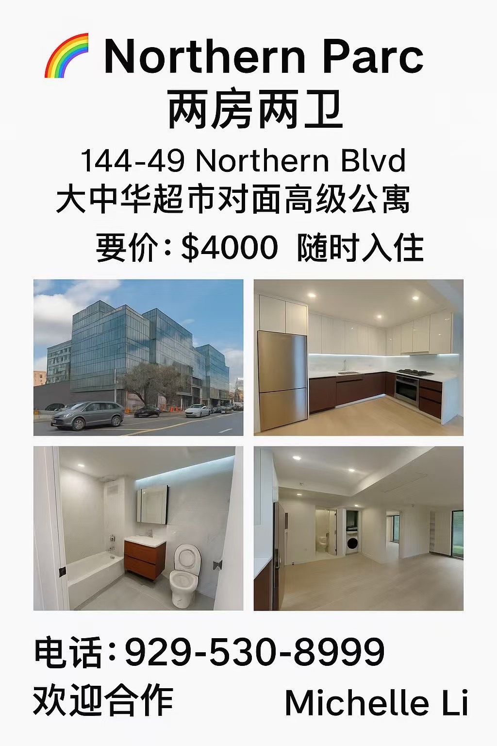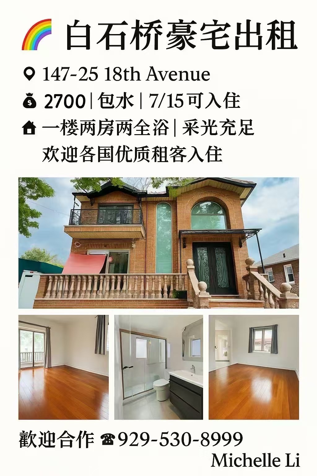 以⬇️欢迎合作🌈白石桥豪宅一楼出租 📍147-25 18th Avenue2600💰包水 🈚️宠 随时入住 两房两全浴 钻石屋况 拎包入住(7/15入住)🌈Northern Parc两房两卫欢迎合作144-49 northern blvd